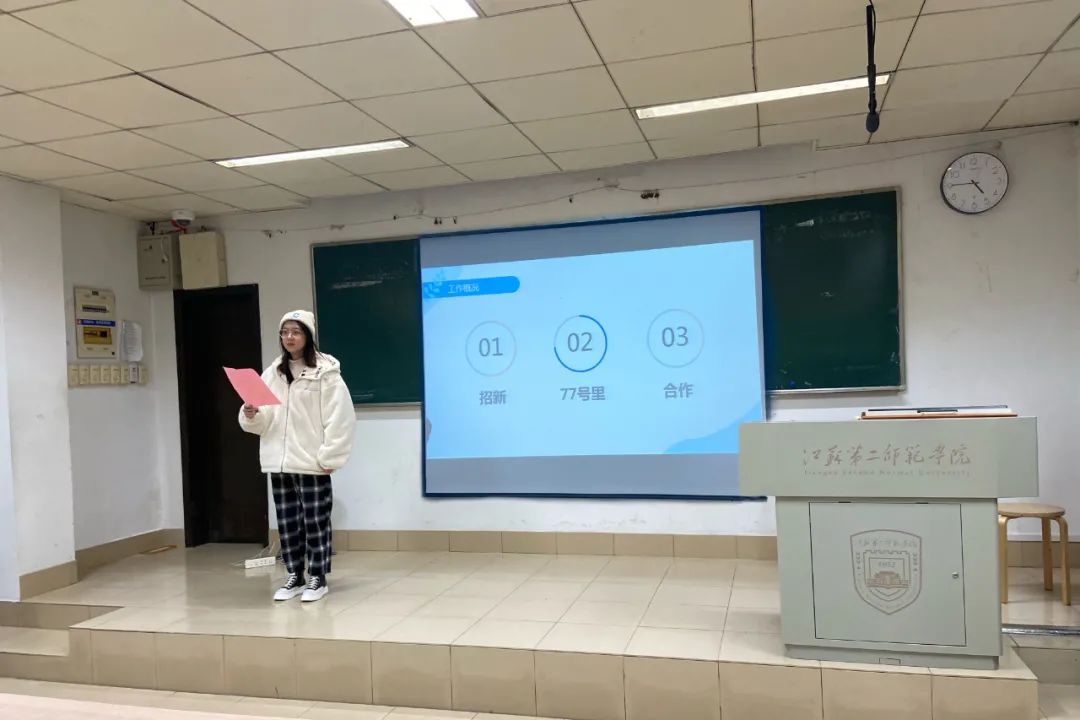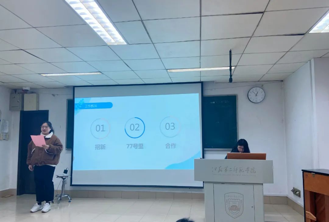 2022年1月4日中午12:40,江苏第二师范学院美术学院第二十二届学生会第二次全体大会于草场门美术学院北楼101教室召开。美术学院学生会主席团以及全体主干到场参与本次会议,全体实践团团员到场聆听。本次大会由学生会办公室主任朱英杰主持。