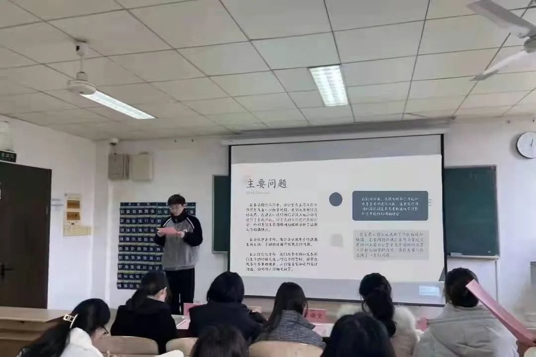 办公室副主任秦梓玮发言。他总结本学期工作以网站的更新发布为主,辅以会议记录、会议准备以及发票和其他材料收集,以及辅助其他部门的活动准备与开展。主要问题为会议准备方面,多媒体的使用不熟练,与老师和主干们的交流不够等。