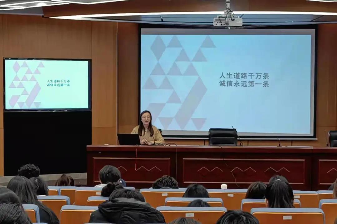 其次,由章砚文详细解读考风考纪。先为同学讲解本科生学士学位授予规定,强调了遵守法律,遵守校规校纪。然后,讲解了学生手册上关于考试纪律的条目,让同学们了解了哪些行为是作弊行为并告知其后果,还讲解了破格申请学士学位条件,之后还举真实案例加以说明。最后,给同学们提供了一些期末复习方法,还和同学举自己的例子分享复习经验,并提出金句“人生道路千万条,诚信永远第一条”!