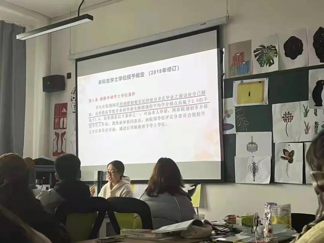 1月5日上午十点,白丽老师通过我校《本科生学士学位授予规定》导入,详细为同学们讲解了申请学士学位的具体要求,如:遵守法律,遵守校纪校规;修满本科人才培养计划规定的学分;所修课程平均学分绩点不低于2.0;满足外语水平要求;通过计算机等级考试。其次,重点强调了不授予学士学位的几种情况,如:受到留校察看或以上纪律处分者等。同时介绍了解破格申请学士学位的条件,以此来突出强调考风考纪的重要性。