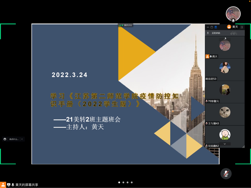 各班级班长召开《江苏第二师范学院疫情防控知识手册》学习班会,详细解读手册内容,指导学生正确做好校园防疫,强调戴口罩的重要性,普及正确戴口罩知识。叮嘱同学们要做到注意个人卫生、勤消毒多通风等,要求同学们全面做好个人防护,勤洗手,不聚集、不扎堆,减少外卖,非必要情况不网购。在校期间严格遵守学校疫情防控管理各项规定,每天监测体温情况,积极配合做好核酸检测等工作。