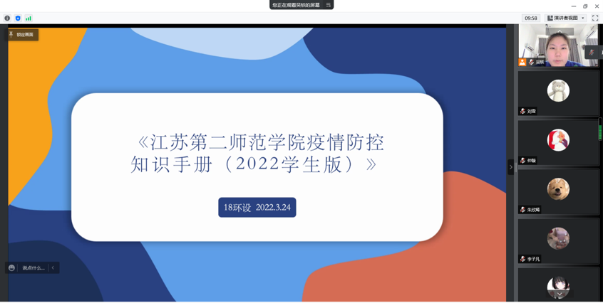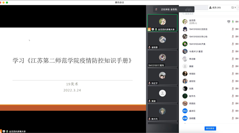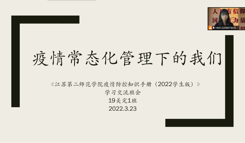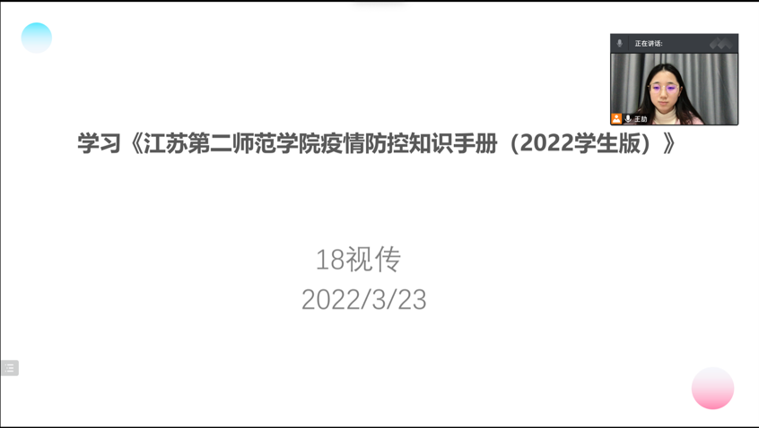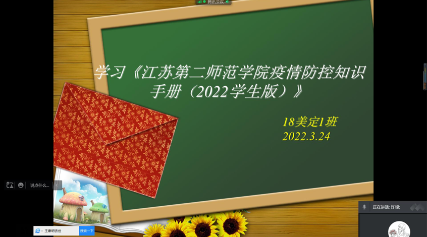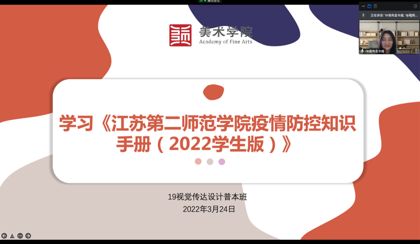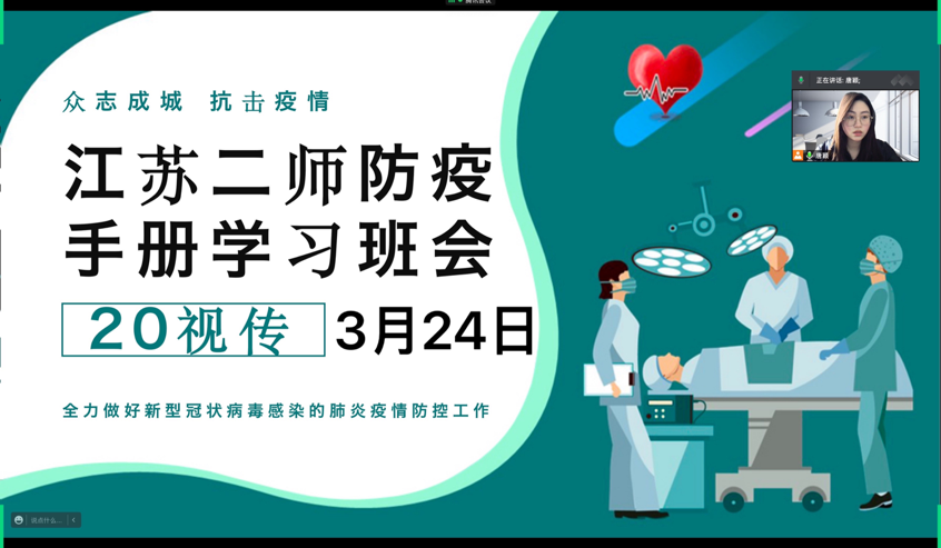 为认真贯彻落实学校疫情防控重要指示精神和各项决策部署,我院近期召开学生干部例会和班会,组织全体学生学习《江苏第二师范学院疫情防控知识手册》,提高同学们的疫情防控意识和自我保护能力。