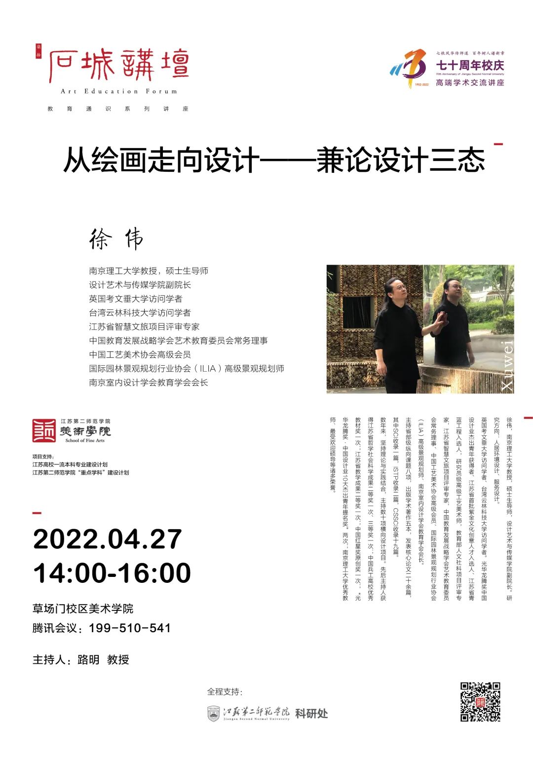 特邀专家:南京理工大学教授,硕士生导师、设计艺术与传媒学院副院长、英国考文垂大学访问学者、云林科技大学访问学者、江苏省智慧文旅项目评审专家、中国教育发展战略学会艺术教育委员会常务理事、中国工艺美术协会高级会员、国际园林景观规划行业协会(ILIA)高级景观规划师、南京室内设计学会教育学会会长 徐伟先生