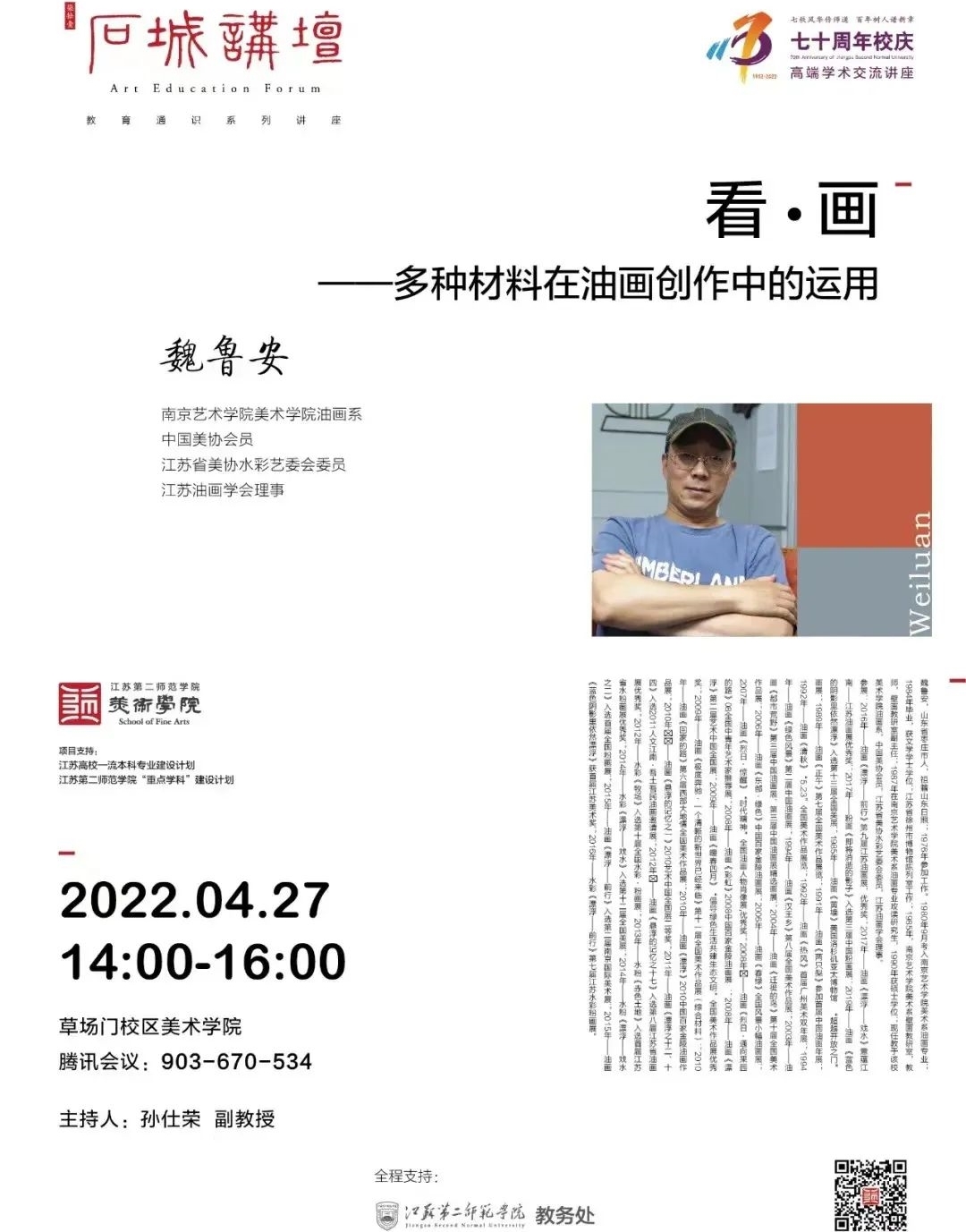 2022427日,南京艺术学院美术学院副教授魏鲁安应邀作了题为《看画——多种材料在油画创作中的运用》的线上讲座。本次讲座由美术学院副教授孙仕荣主持,全体美术学专业同学线上学习。