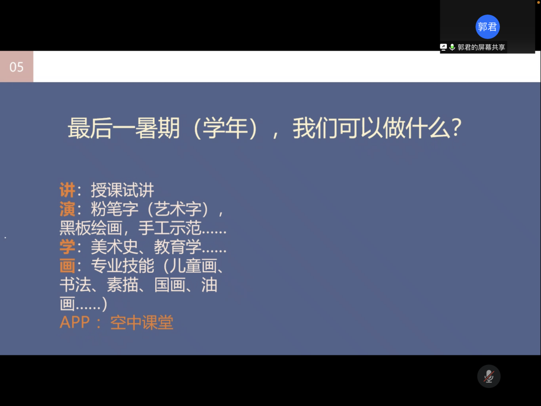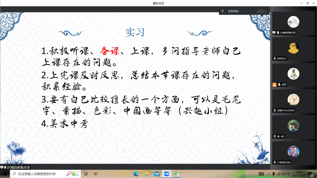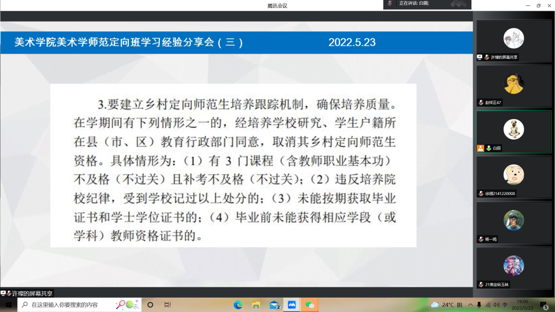 为提高乡村定向师范生的培养质量,我院于3月16日、5月17日和5月23日举办美术学师范定向班经验分享会。来自18级美术定向班的13名党员学生分别为19级、20级和21级美术定向班做经验分享。分享会由美术学院学工办主任白丽老师主持。