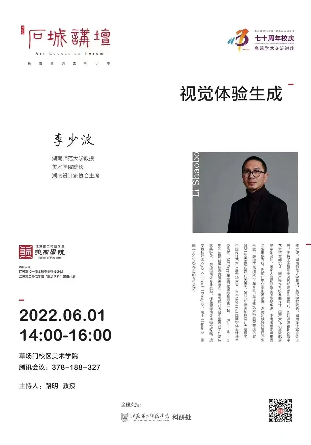 6月1日下午2点,湖南师范大学教授、美术学院院长、湖南设计家协会主席李少波应邀作在美术学院举办《视觉体验生成》线上讲座。讲座由美术学院院长路明教授主持,视觉传达设计专业、环境设计专业师生在线学习,设计专业教师在线参与。