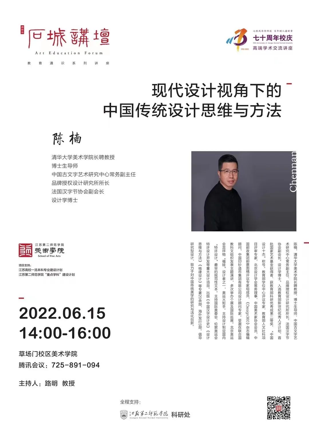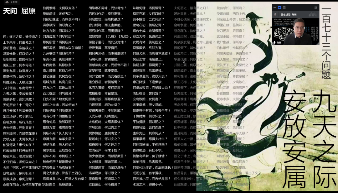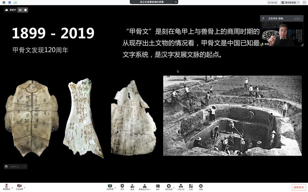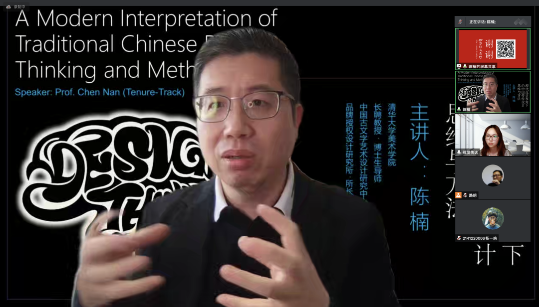 6月15日14:00,清华大学美术学院长聘教授、博士生导师、中国古文字艺术研究中心常务副主任陈楠应邀做《现代设计视角下的中国传统设计思维与方法》线上学术讲座。讲座由美术学院院长路明教授主持,美术学院全体师生参加学习。