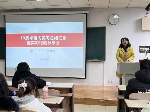 为切实提高乡村教师定向培养质量,促进我校师范定向专业发展,全面提升师范定向生综合能力和素质,美术学院于2月23日下午举行2019级美术学师范定向生实习总结汇报暨实习经验分享。美术学院党总支书记王玲玲和学工办主任白丽听取了汇报会,2020级和2021级全体美术学师范定向班学生参加了分享会。