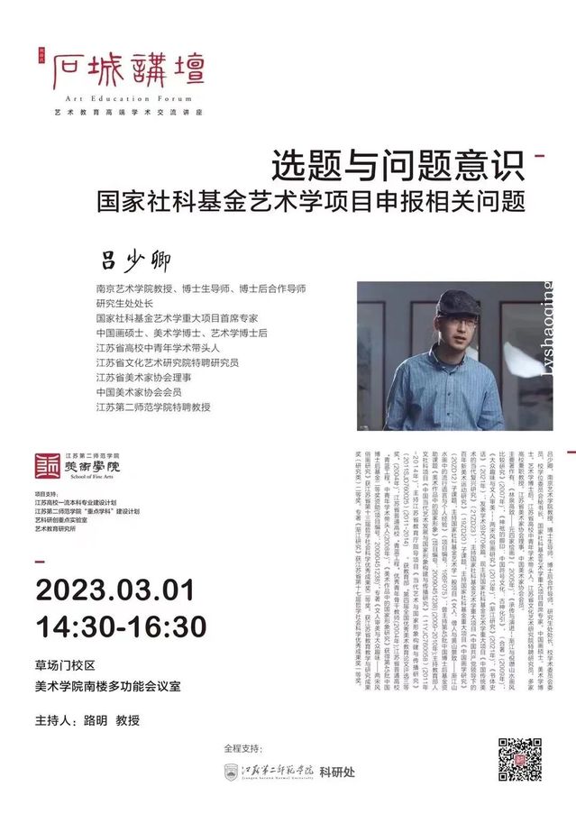 2023年3月1日,南京艺术学院研究生处处长吕少卿教授应邀作题为《选题与问题意识:国家社科基金艺术学项目申报相关问题》学术讲座,本讲座由美术学院院长路明教授主持,美术学院全体教师、传媒学院部分教师参加学习。