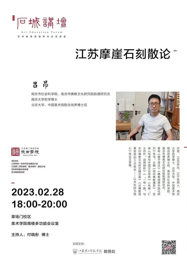 2023年2月28日18:00,南京市社会科学院助理研究员吕昂博士应邀做《江苏摩崖石刻散论》讲座,在美术学院多功能会议室举办。美术学院付晓彤老师主持讲座,2022级美术学转本班全体同学参加学习。