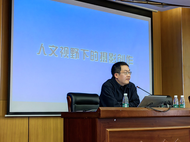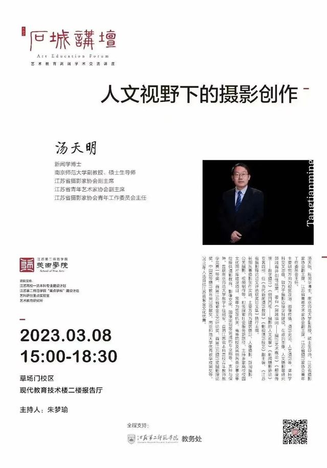 2023年3月8日15:30,江苏省摄影家协会副主席汤天明教授应邀做《人文视野下的摄影创作》学术讲座。本讲座由美术学院朱梦瑜老师主持,于技术楼二楼报告厅举办。美术学院教师,环境设计、视觉传达专业学生参加学习。