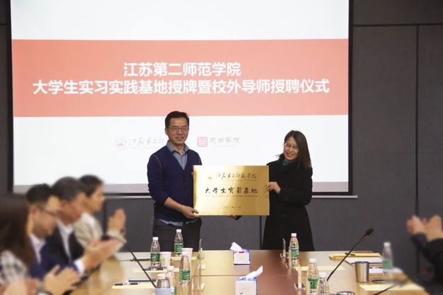 本次实习、实践基地既有以师范类专业实习的南京市著名中小学,也有能为美术学院各专业提供优质平台的省内企业、院所。参加本次仪式的领导和嘉宾有:无锡美术馆副馆长蒋凌、无锡弘展文化旅游投资有限公司董事长傅红庚、南京外国语学校艺术教研组组长曹启海、南京师范大学附属中学树人学校美术教研组组长吴长燕、南京民办育英外国语学校艺术组组长王海英、南京中智文化创意研究院院长王波、南京市园林规划设计院文产旅综合规划所所长汪娟、南京铭邺承天装饰设计有限公司副总经理夏韵、南京一作文化传媒有限公司艺术总监朱存辉、安徽东流古镇写生基地总经理杨玉贵、南京云锦研究所有限公司李晓伟。美术学院副院长陶金鸿,美术学院各教研室主任和教师代表。