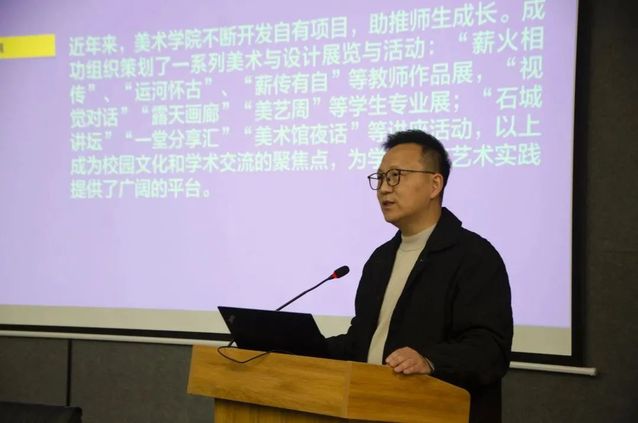 会上,路明院长向与会的单位领导详细介绍了美术学院的发展历程、专业建设、人才培养理念、校企合作等情况,介绍了美术学院近年来建设实习、实践基地工作情况。学校从培养目标出发,需要在实习、实践工作上加强沟通,好中选优,为校校联合、校企联合做好桥梁工作。在学校领导和教务处的指导帮助下,大力推动实践、实习基地的建设工作。他对各校外实习、实践基地单位和各位校外导师大力支持我院专业实践教学和学生成长成才表示衷心感谢。希望各基地和导师充分利用专业背景和优势帮助我院学生提高专业技能、提升就业能力。
