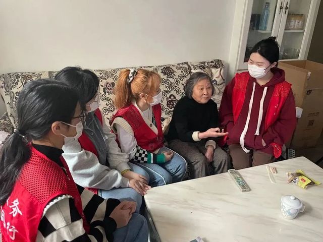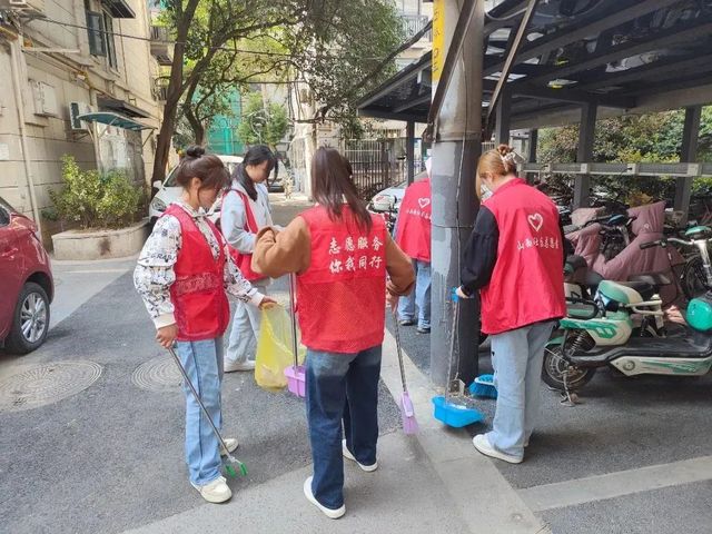 活动中,志愿者们身穿红马甲,分成两组。一组入户慰问老人,另一组打扫社区环境卫生。