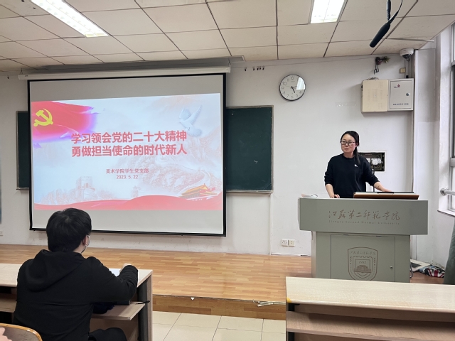 为提高广大学生党员的党性修养,落实“学思想、强党性、重实践、建新功”主题教育的总要求,5月22日,美术学院学生党支部书记白丽在教二203为美术学院学生党支部党员和积极分子上主题教育专题党课-学习领会党的二十大精神,勇做担当使命的时代新人。