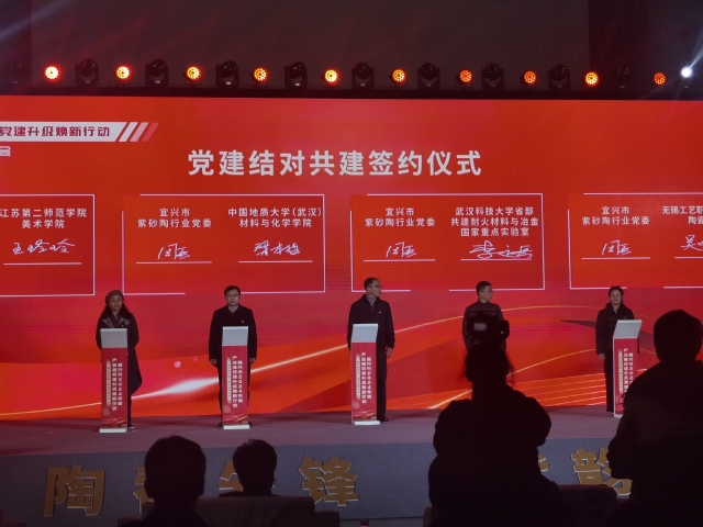 依据中共江苏省委教育工委苏委教函(2024)14号,关于开展“百所高校对接千个产业链党建联盟”行动的通知,根据我院艺术教育专业的特点,前期与无锡宜兴市紫砂陶产业链党委多次联系沟通,希望达成紧密型党建共同体,推动实现党建聚力,资源共享,优势互补,共同发展的目标,为学生发展、就业提供平台,加强校企合作,为地方经济发展赋能。2024年12月10日我院党总支书记王玲玲、教工党支部书记薛岩赴宜兴参加产业链党建升级焕新行动,共同商议合作意向,签订党建结对共建协议,薛岩被聘为“公益课堂讲师”。