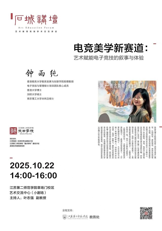 20251022日,美术学院特别邀请到香港教育大学教育发展与创新学院助理教授、电子竞技与管理硕士项目团队核心成员、香港大学博士、剑桥大学硕士、南京理工大学本科及硕士钟雨纯,以电竞美学新赛道:艺术赋能电子竞技的叙事与体验为核心主题,为美术学院环境设计专业的同学们带来了一场兼具专业性与实用性的精彩讲座,同时结合个人成长与求学经验,为学子们的职业规划与学业发展提供了宝贵指引。