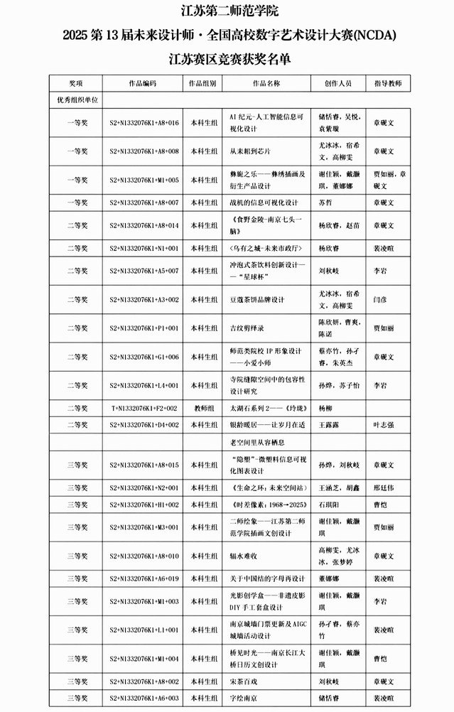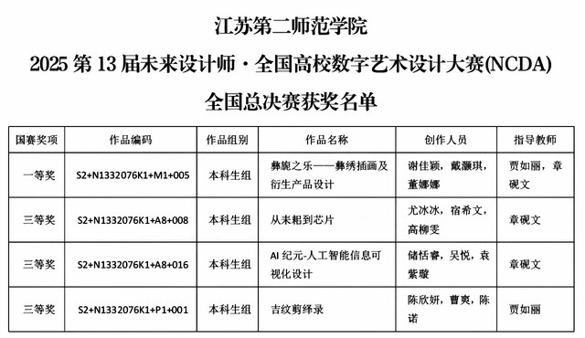 近日,2025年第13届未来设计师·全国高校数字艺术设计大赛(NCDA)全国总决赛与江苏赛区竞赛相继落下帷幕。我院师生凭借扎实的专业素养与卓越的创新精神奋勇拼搏,在全国1893所高校、29万余件作品的激烈角逐中脱颖而出,斩获国家级一等奖1项,国家级三等奖3项;省赛一等奖4项、二等奖9项、三等奖11项,成绩斐然!