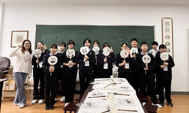 陆梦滢在苏州迎春中学实习期间,于韩国大邱立石中学来访交流时任助教,聚焦中国画技法教学,从握笔运墨基础教起指导两校学生共绘熊猫,在笔墨互动中传递中式美学,助力中韩学生增进文化理解、推动跨文化交流。