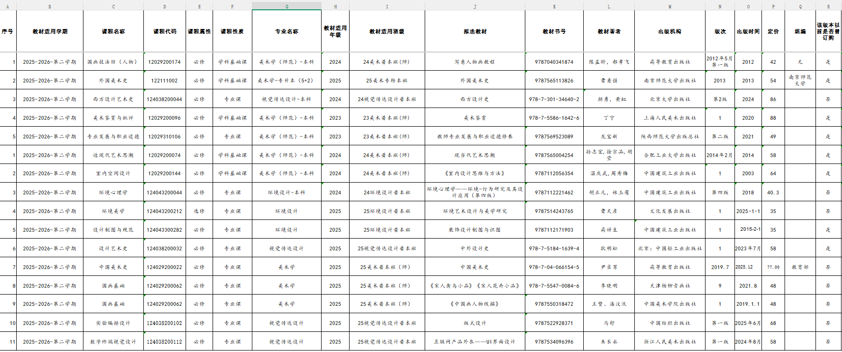 美术学院2025-2026学年第二学期教材选用结果公示