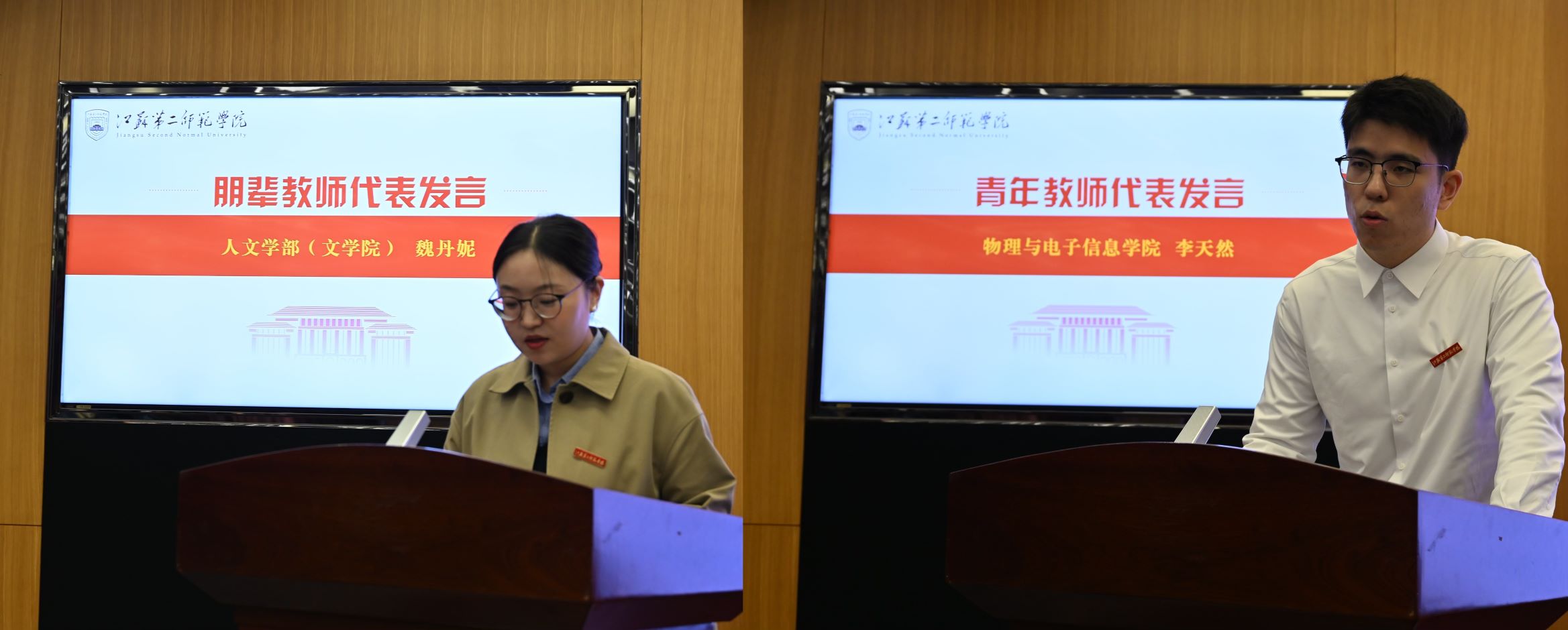 随后,人文学部青年教师魏丹妮代表朋辈教师发言。她从教学、科研和指导学生等方面,与大家分享了她入职以来的成长感悟,希望新教师们走出小天地,打开大视野,积极融入团队和集体,扎实耕耘,稳步前进。物理与电子信息学院教师李天然代表新教师发言。他号召大家以饱满的热情投入工作,以务实的态度对待教学,以严谨的精神深耕科研,以真诚的心态融入集体。