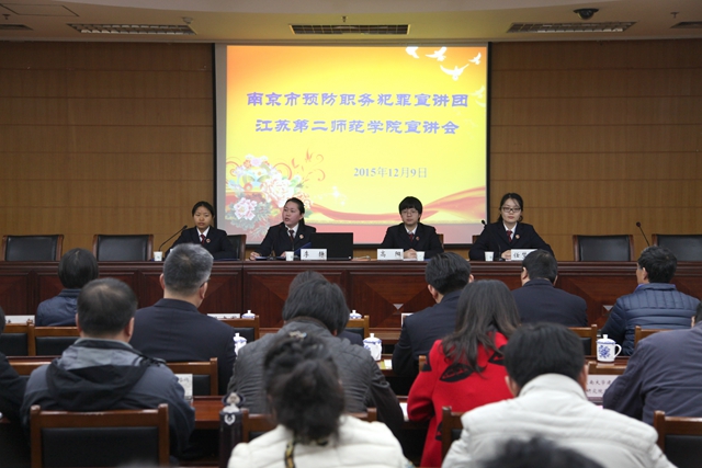 第二阶段,南京市预防职务犯罪宣讲团的四位检察官作了宣讲。她们结合在省内外高校招生、基建、后勤、科研领域发生的职务犯罪案例和某工学院院长的忏悔,勉励大家要把好预防职务犯罪的“初始关、亲情关、节庆关、交友关、酒色关、小节关”,珍惜政治生命、珍惜个人前途、珍惜家庭幸福,做到自重、自省、自尊、自律。
