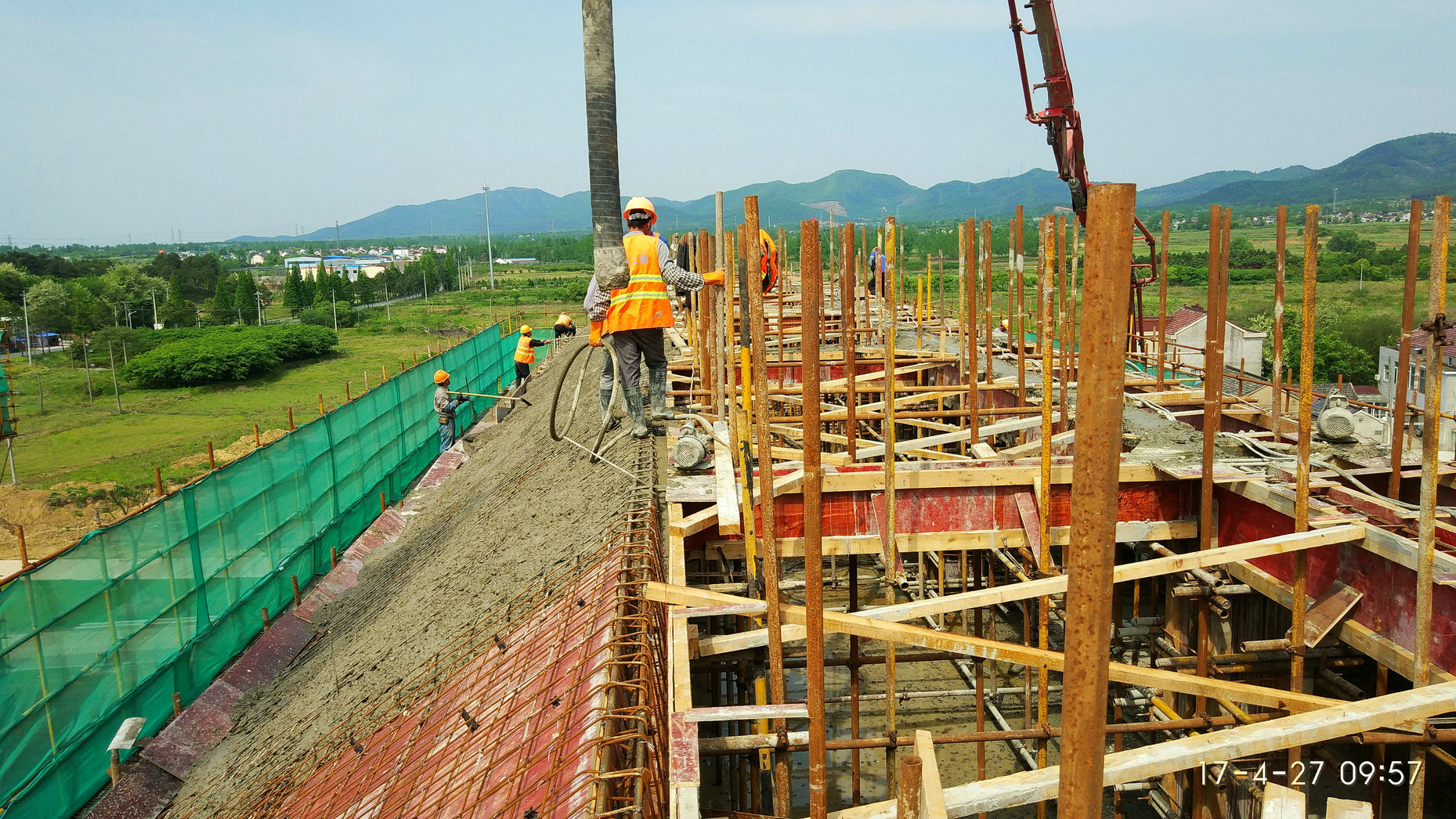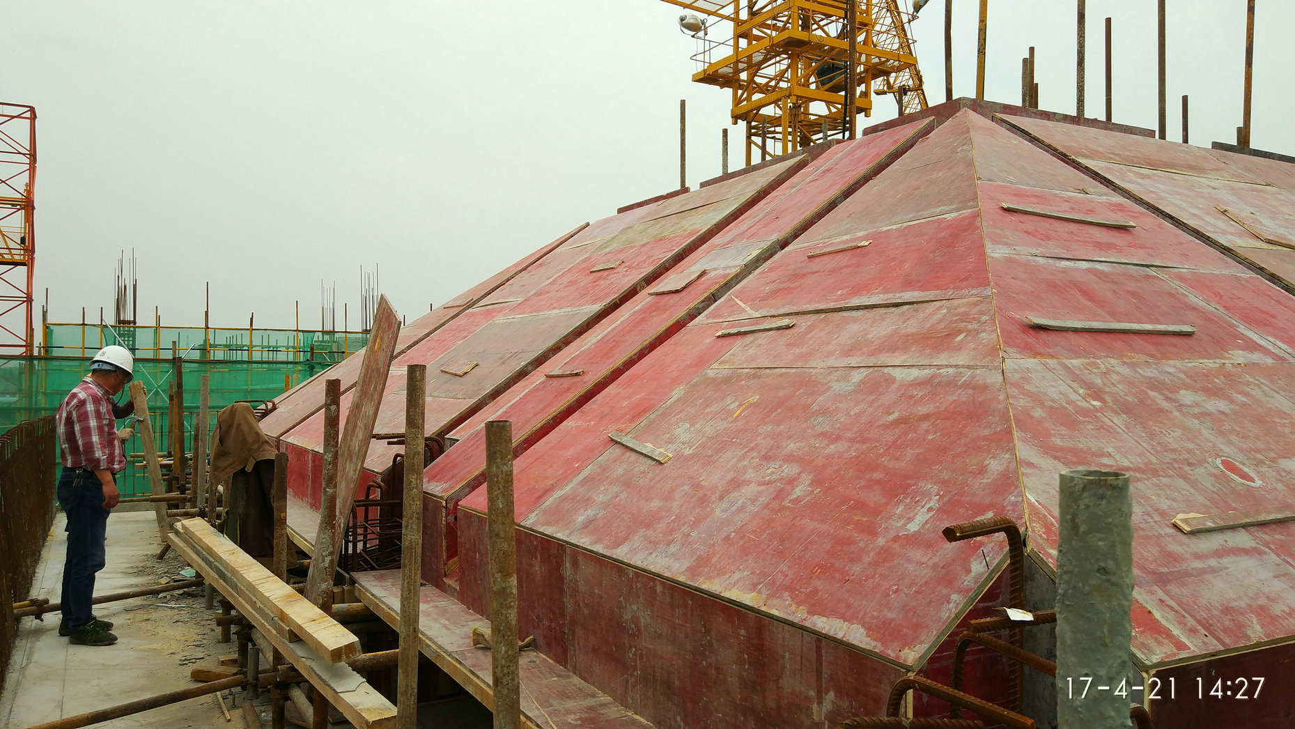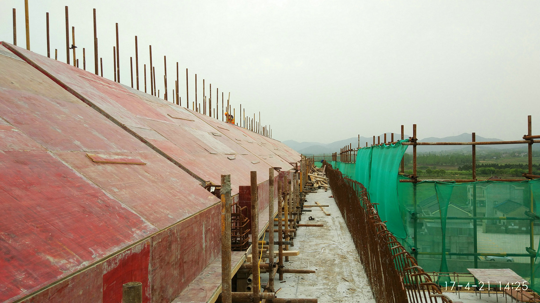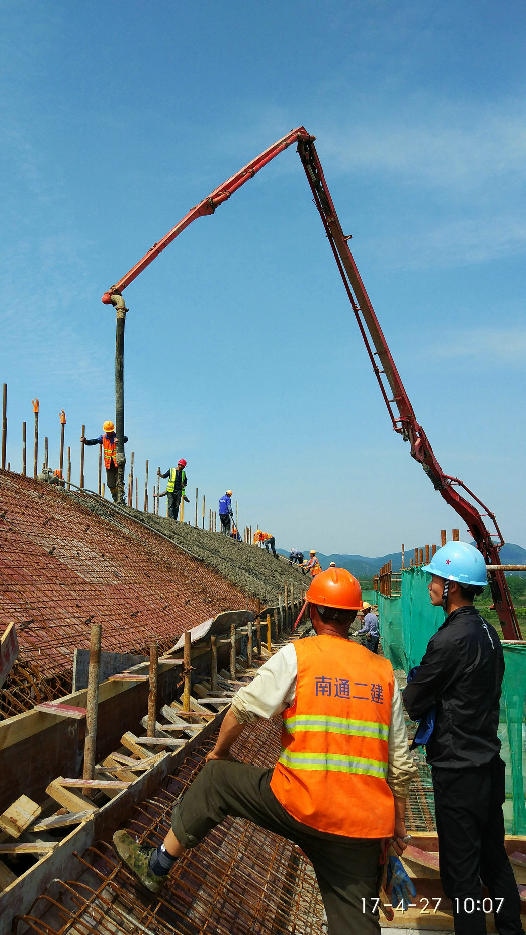 2017年4月21日,学生宿舍7#-2坡屋面进行模板制作,钢筋绑扎,27日完成混凝土浇筑。