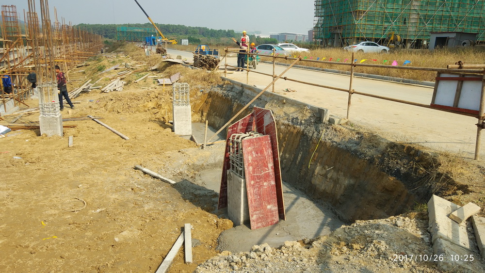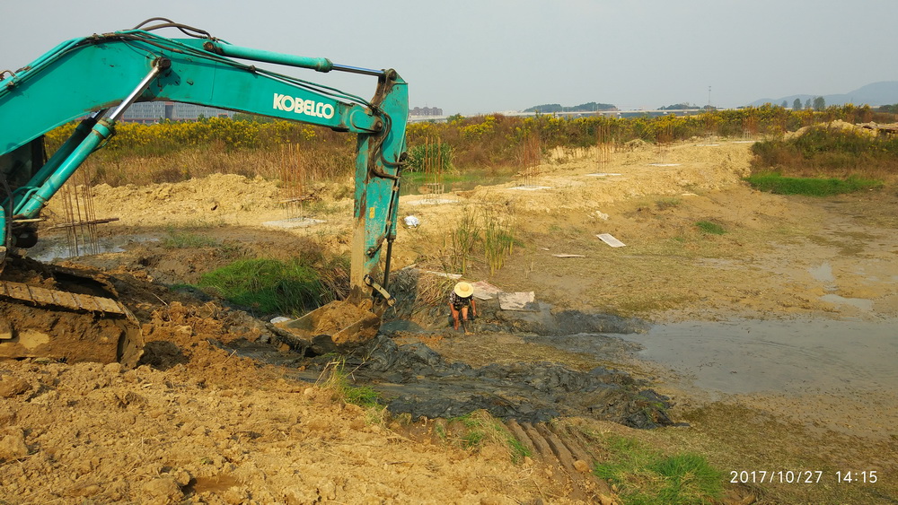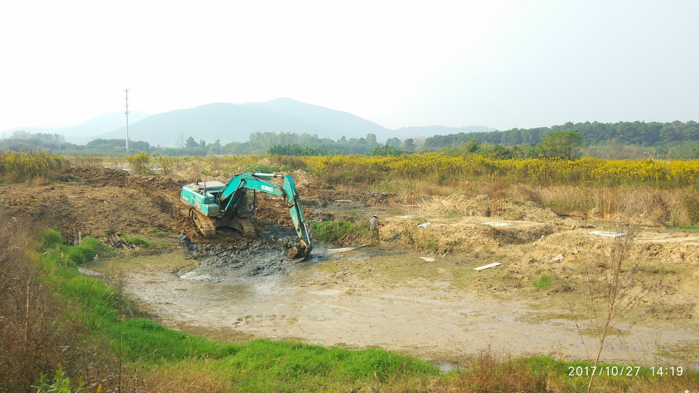 二、校区景观水系开始开挖,水边栈道挡墙施工完成,校区北侧河塘抽水、清淤、土方回填,杏坛讲坛基础施工,完成垫层浇筑。