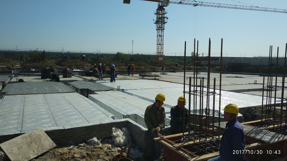 一、体育馆完成防水卷材铺装,准备进行基础承台钢筋绑扎。