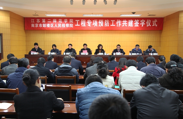 12月9日下午,我校与南京市鼓楼区人民检察院在草场门校区举行关于溧水校区工程专项预防共建工作会议。鼓楼区人民检察院检察长杨建萍、副检察长梅琨,我校党委书记李洪天,校领导程建军、张勤、刘青平、潘文、王晓天出席大会。鼓楼区检察院预防局的检察官、南京市预防职务犯罪宣讲团成员、我校全体中层干部以及部分科长130多人参加大会。纪委书记刘青平主持大会。