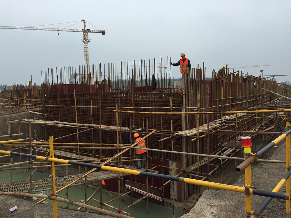 12. 消防水池墙板模板完成,水池顶梁、平台钢筋绑扎至50%。