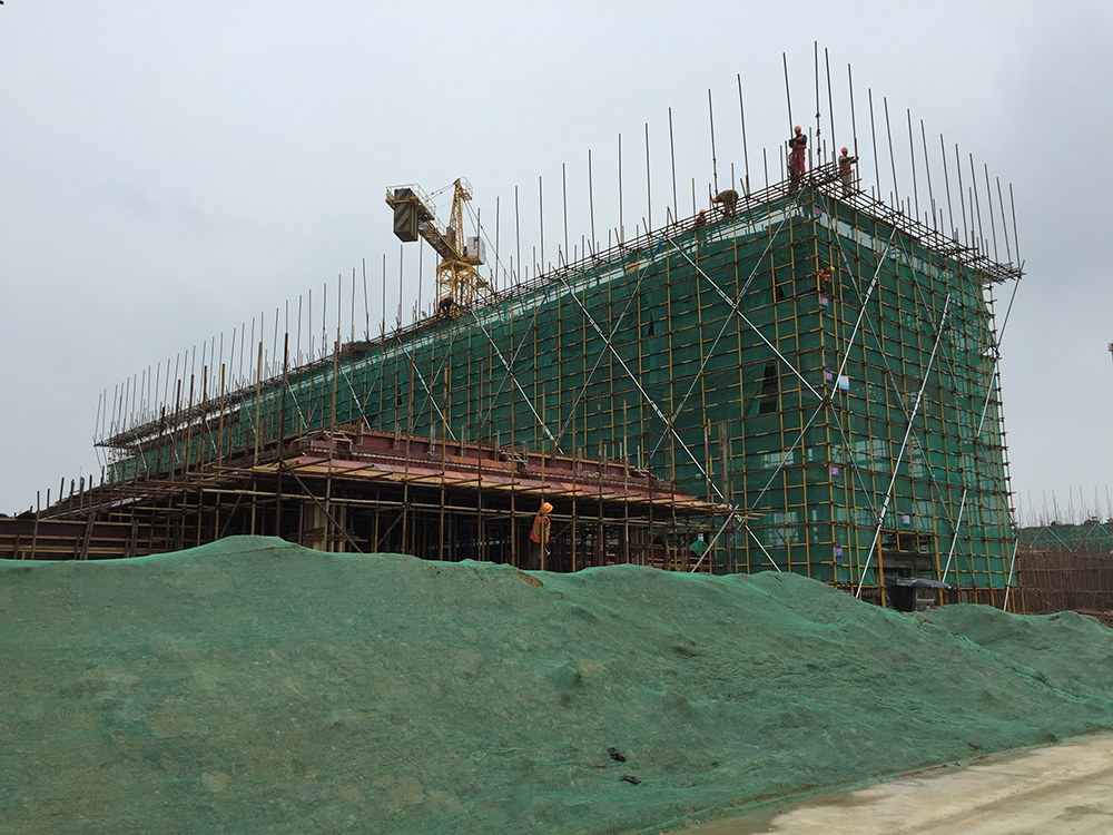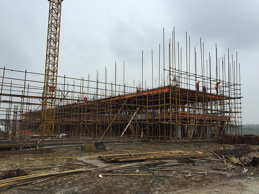 15. 报告厅基础梁排架搭设结束。