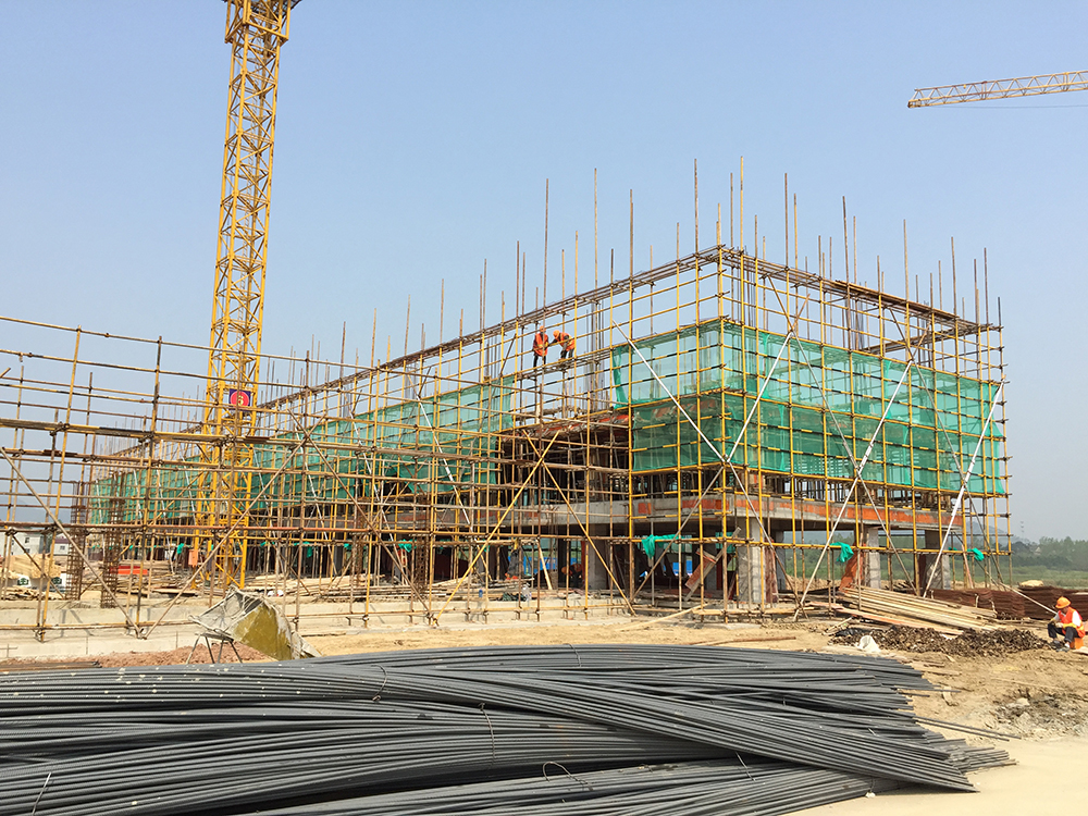 9. 二食堂一层排架搭设完成,二层楼面梁板模板完成,钢筋绑扎完成50%