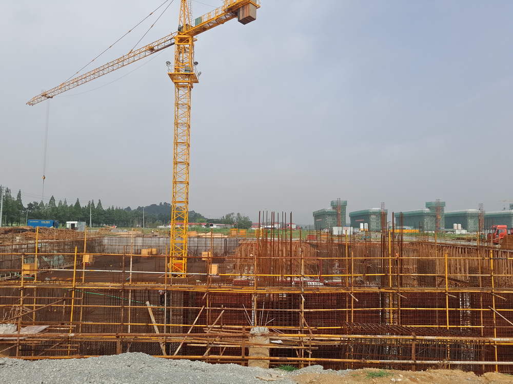 2. 图文信息中心:高支模架底硬化完成,柱钢筋绑扎完成50%,一层排架完成50%