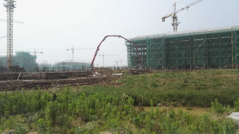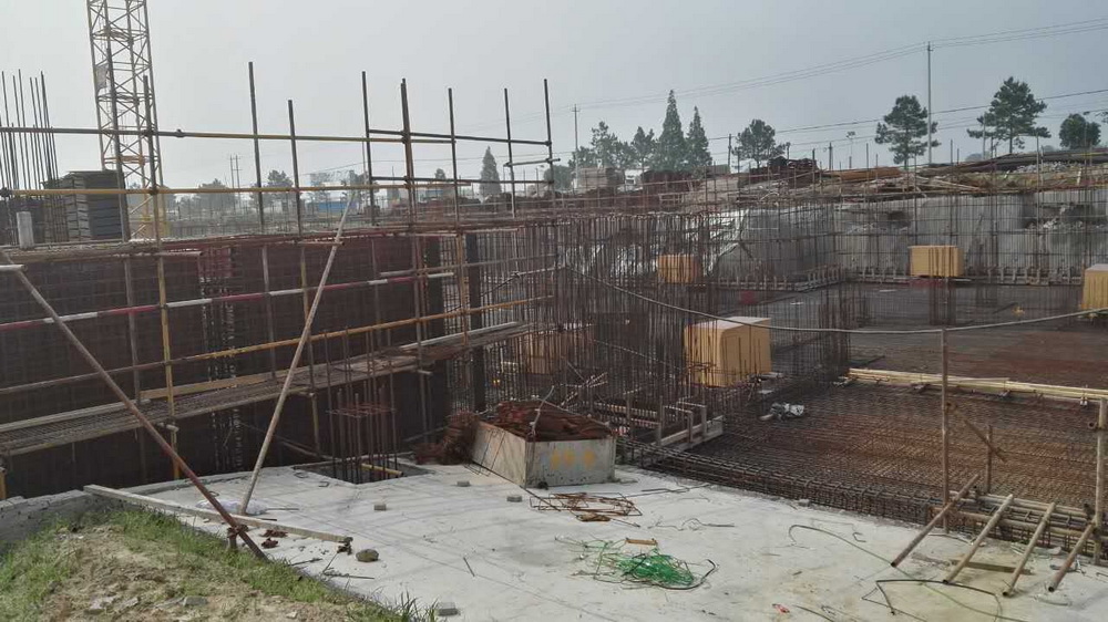 9. 行政楼:1~13轴/A-H~J轴底板砼浇筑完成,墙板钢筋绑扎完成;1~13轴/R-H~J轴地下室排架搭设完成,梁钢筋绑扎结束,墙板模板完成。