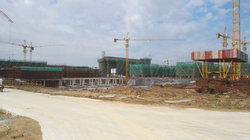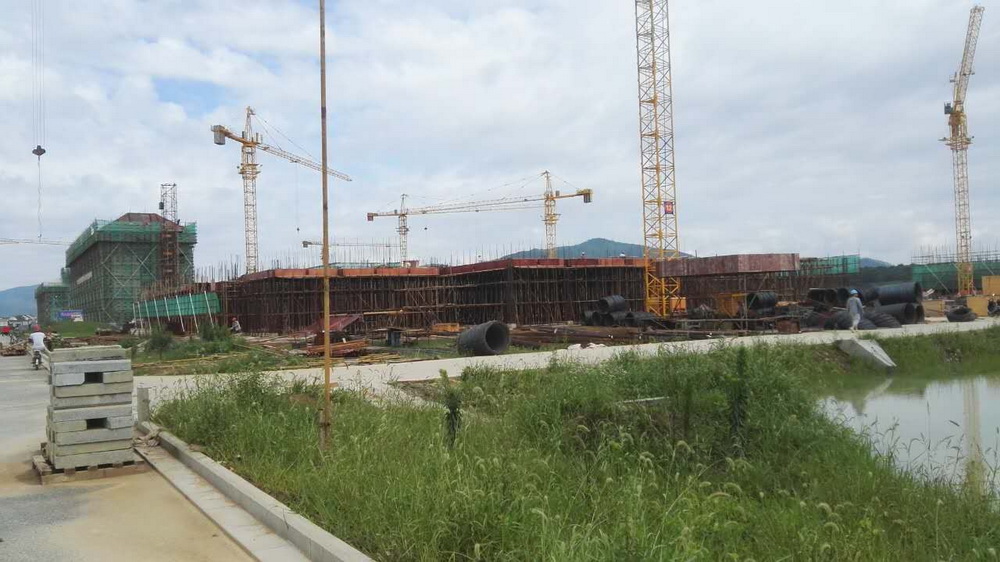 6. 行政楼:1-13/A-(H`J轴间)底板砼浇筑结束,1-13/A-(H`J轴间)-R轴地下室排架搭设完成,梁钢筋绑扎结束,墙板模板完成。