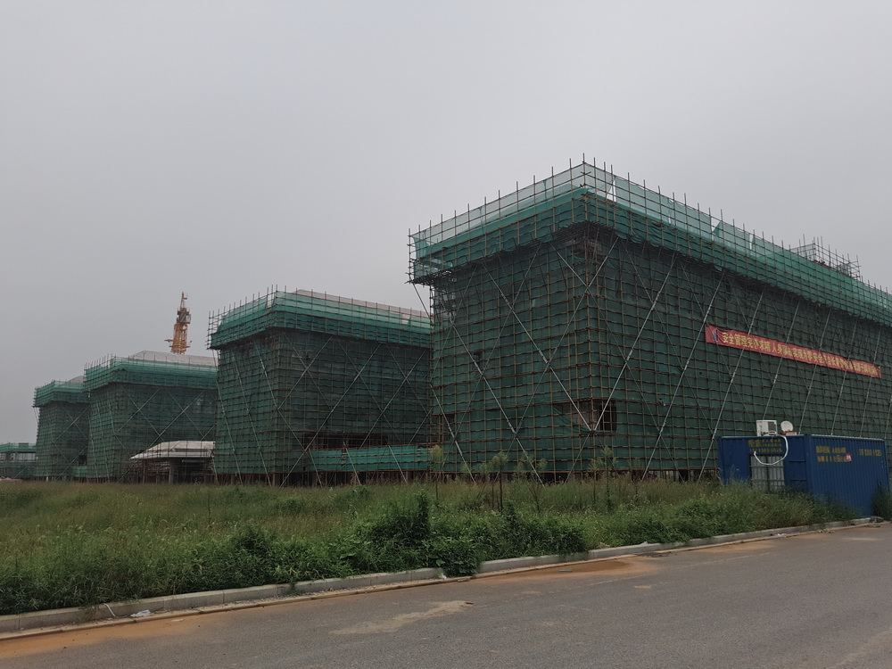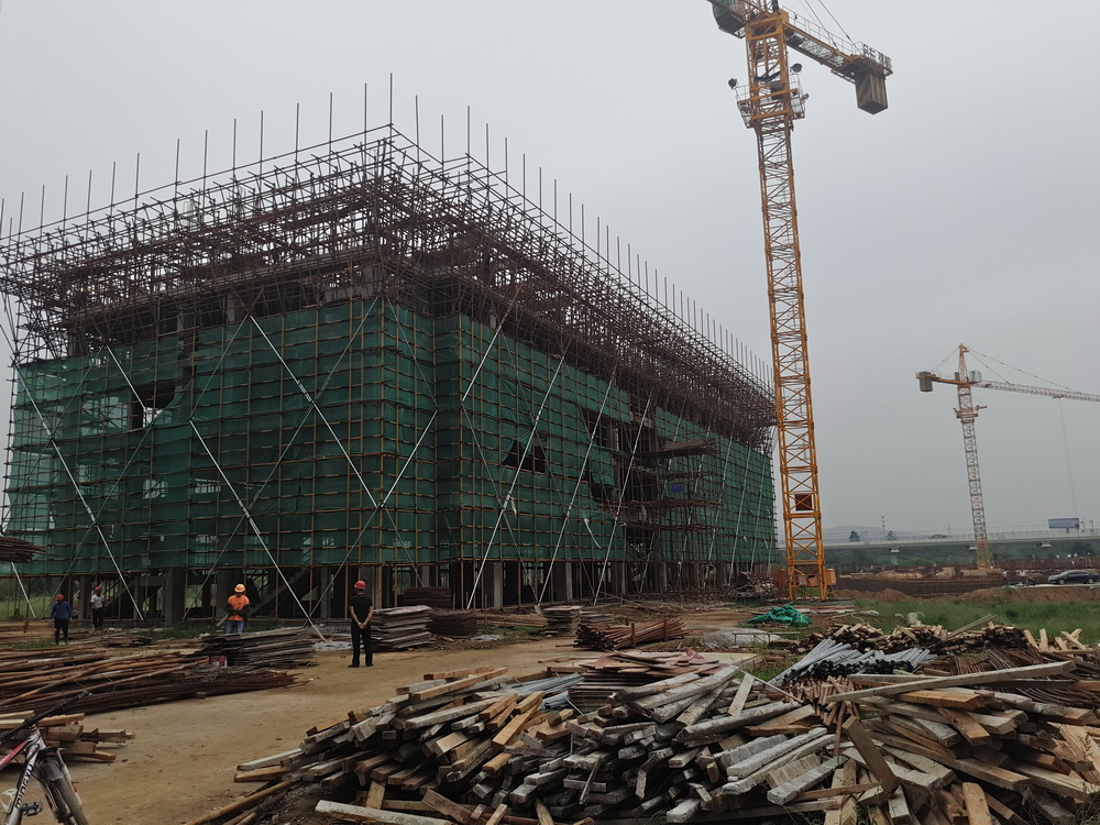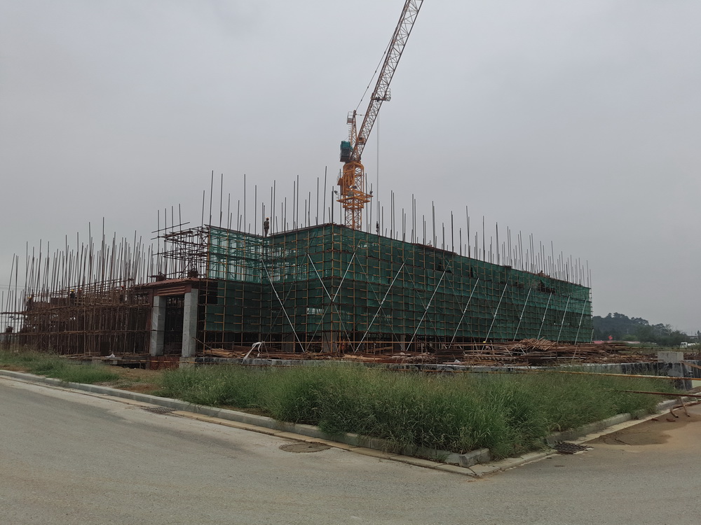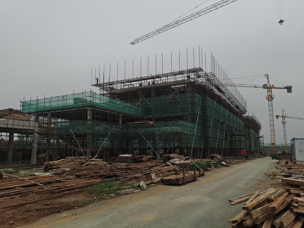 2. 图文信息中心:三层砼浇筑结束,四层排架完成70%,模板完成50%,柱钢筋完成50%。