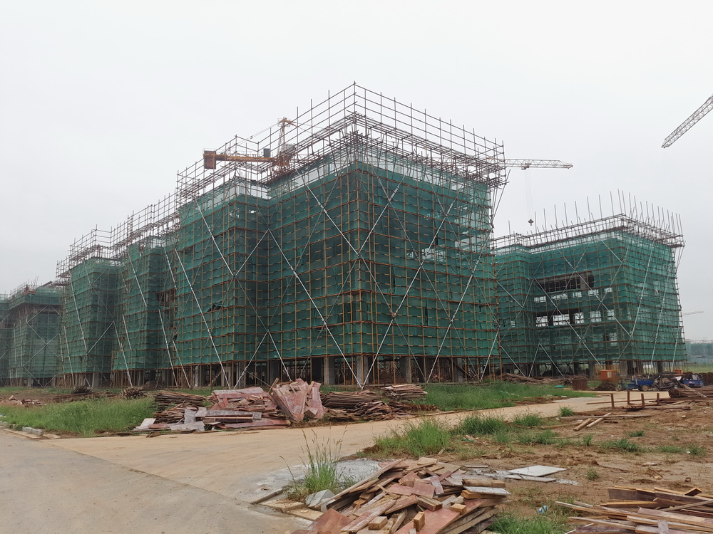 15. 青年教师周转公寓:屋面排架完成,模板完成80%,柱子钢筋绑扎完成。