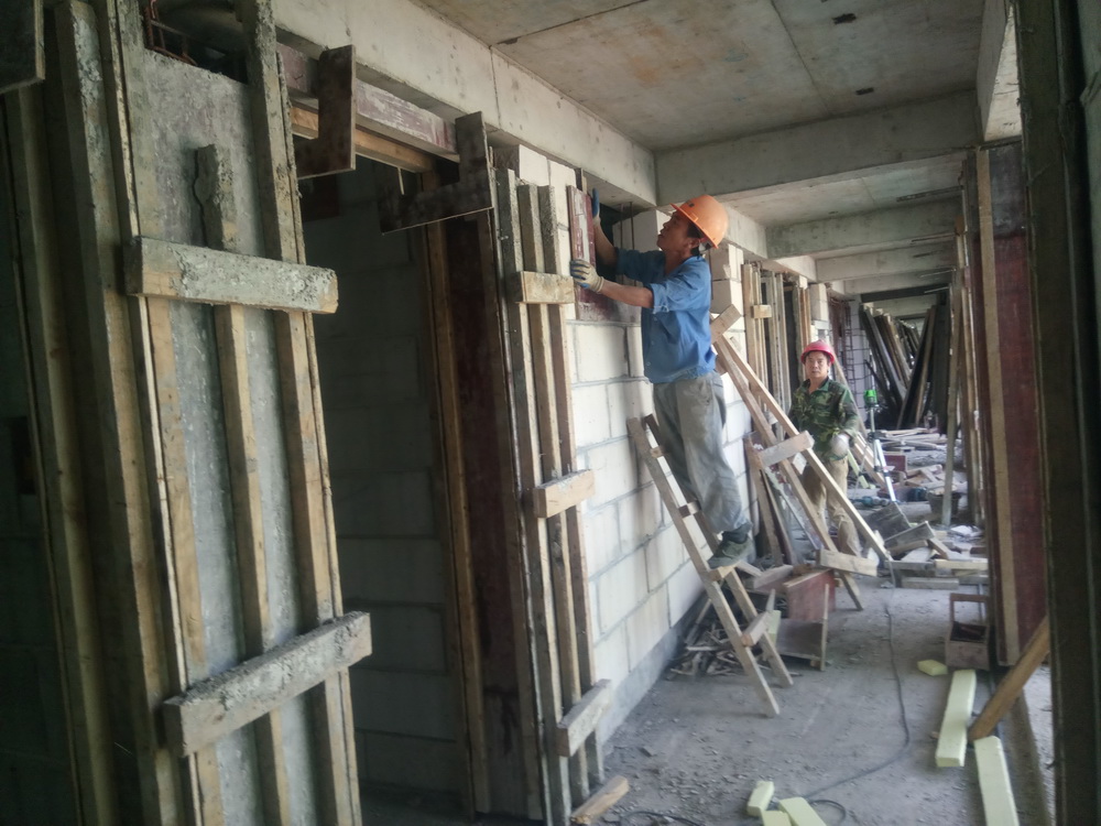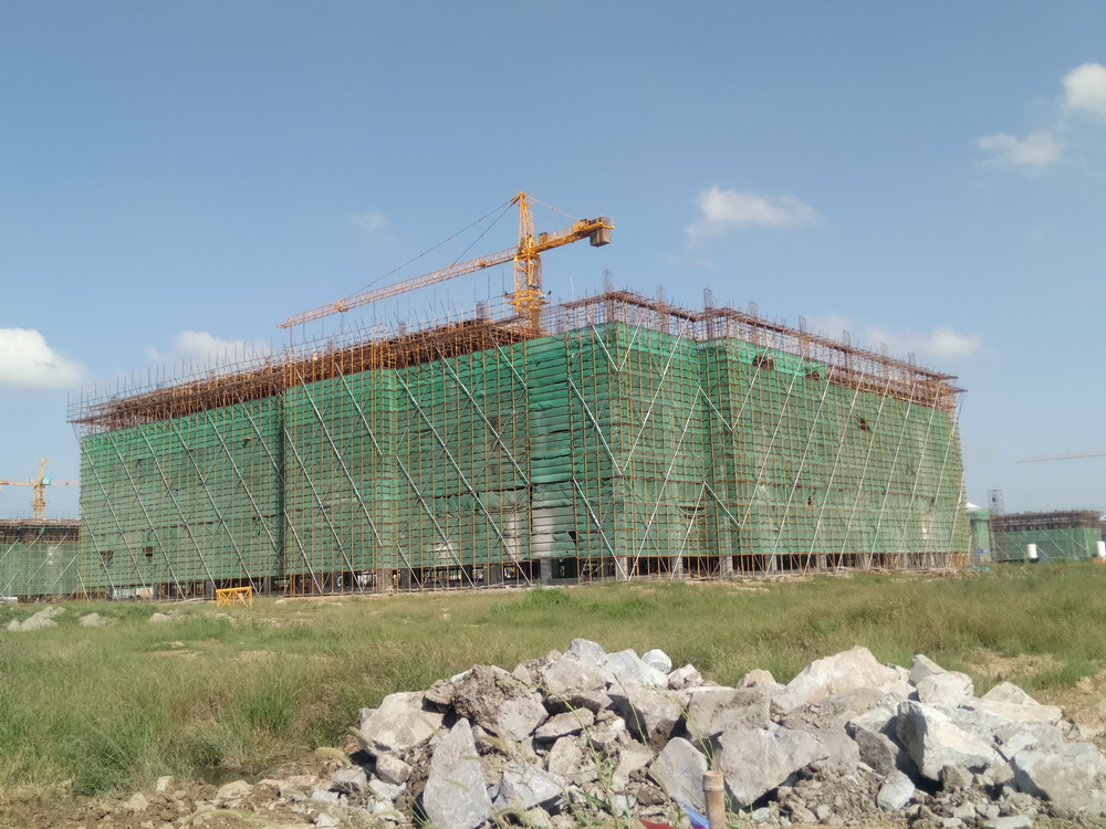 13. 二食堂:二层、三层墙体砌筑,二次结构制模,屋面塔楼模板安装。