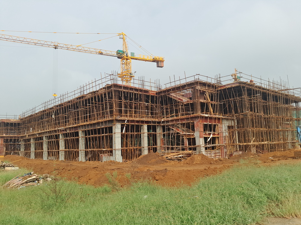 2. 理科楼二:斜屋面层排架搭设完成80%,钢筋绑扎完成50%。