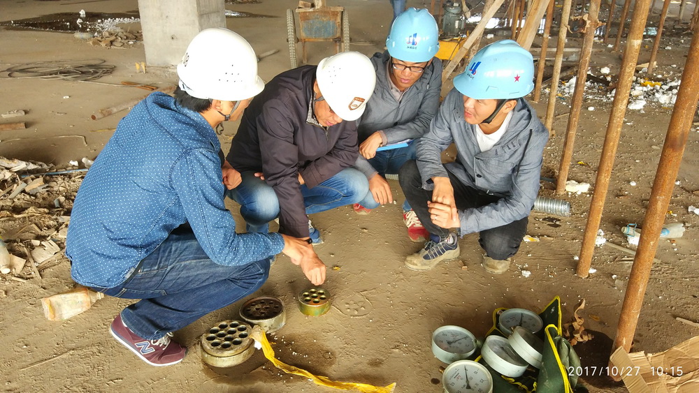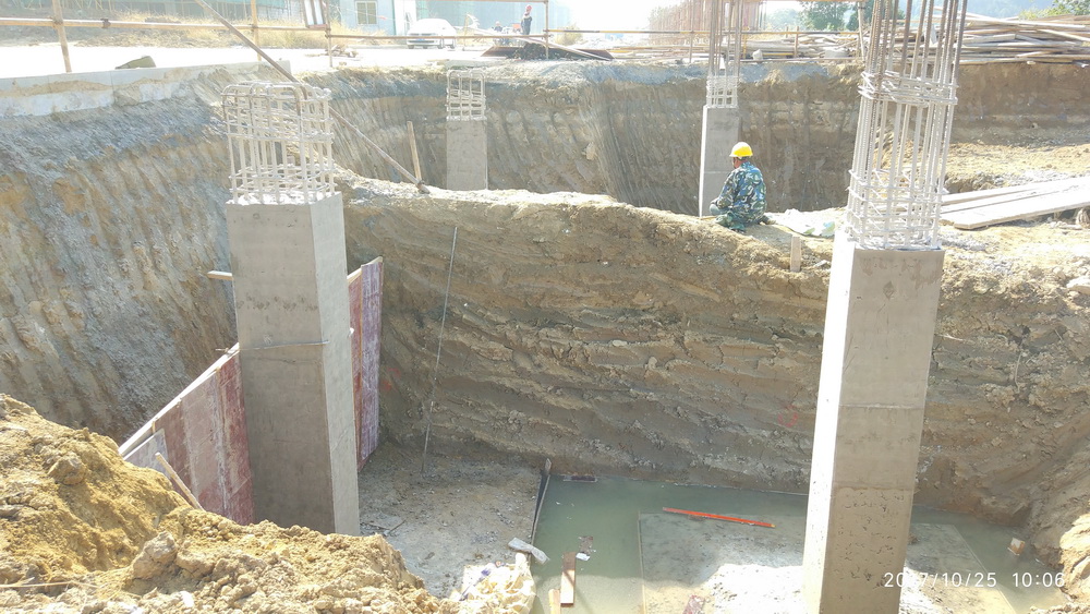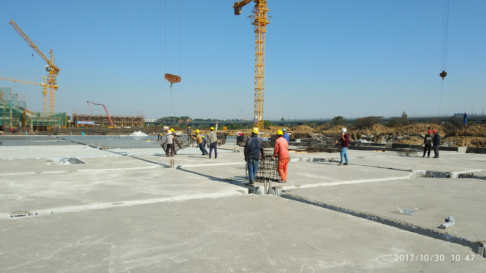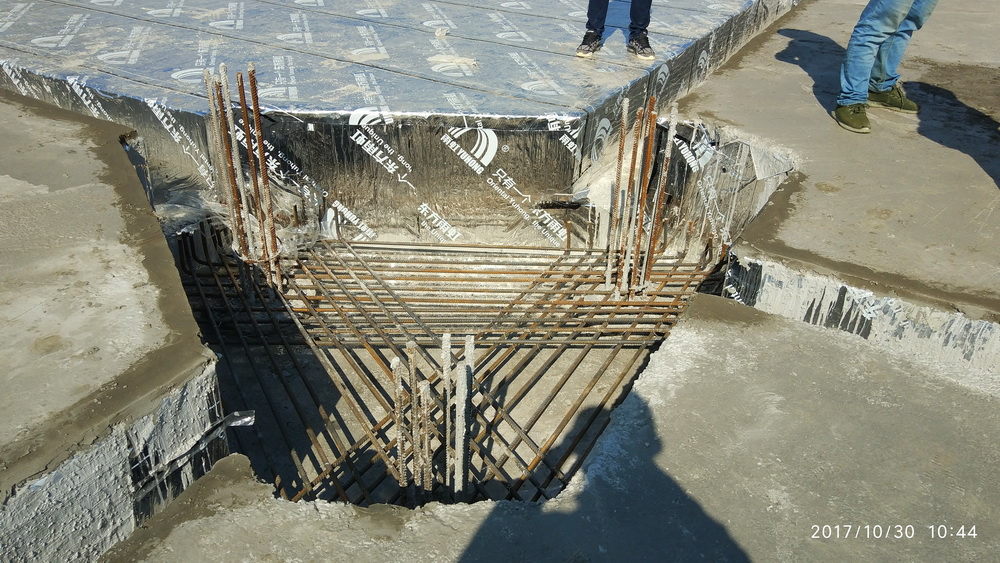 一、体育馆完成防水卷材铺装,准备进行基础承台钢筋绑扎。
