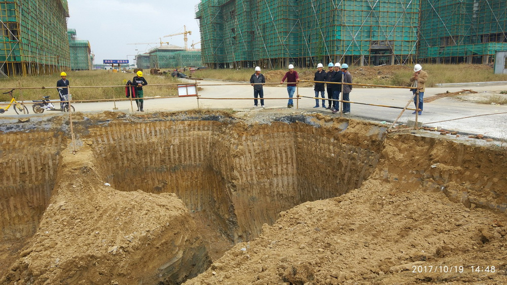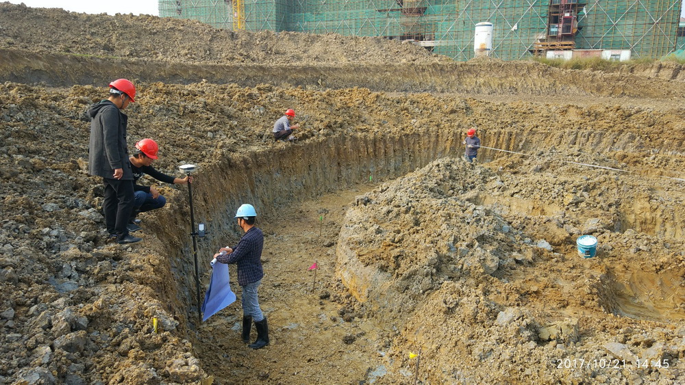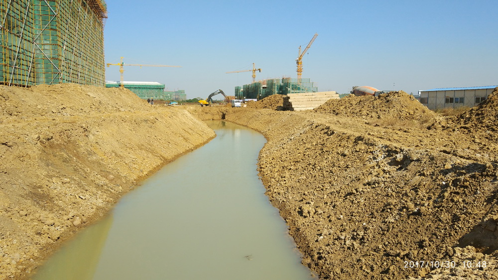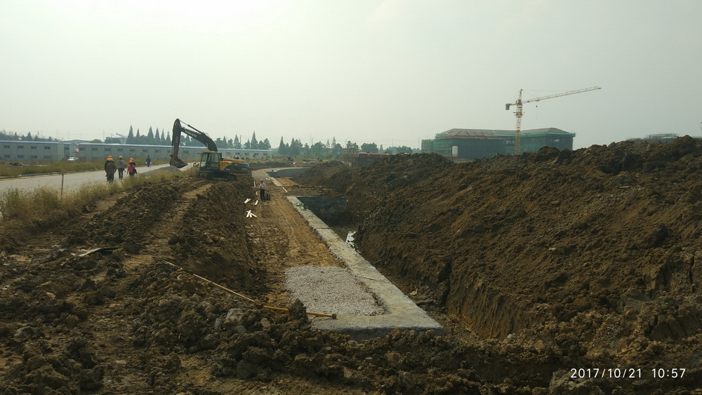 二、校区景观水系开始开挖,水边栈道挡墙施工完成,校区北侧河塘抽水、清淤、土方回填,杏坛讲坛基础施工,完成垫层浇筑。