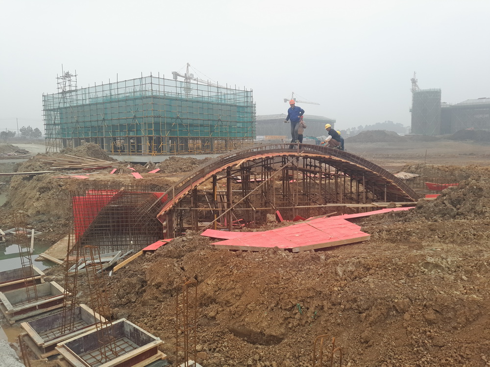 8. 人行拱桥基础浇筑完成,拱桥钢筋绑扎完成70%。