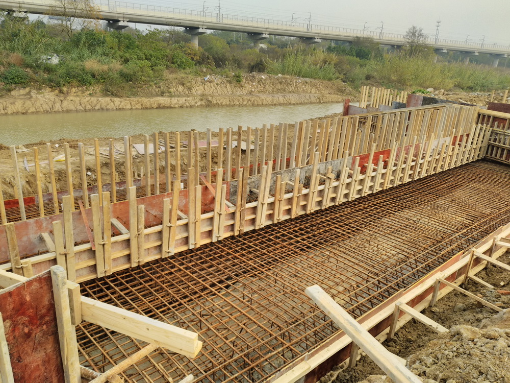 1. 溢流堰钢筋绑扎完成,模板完成50%;