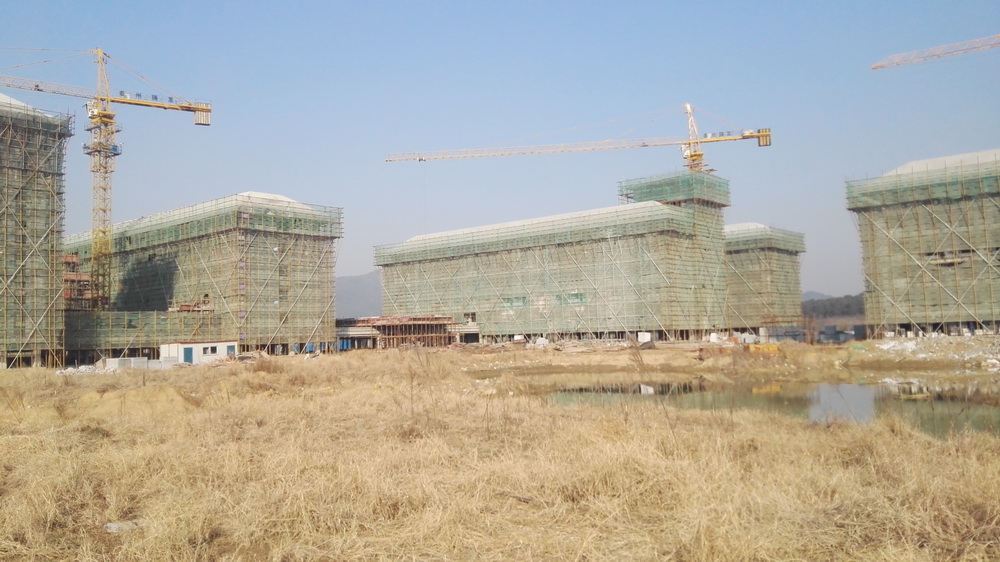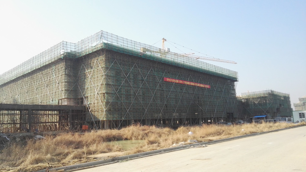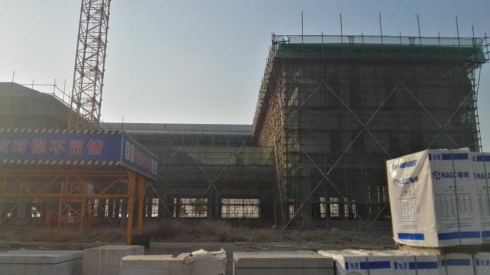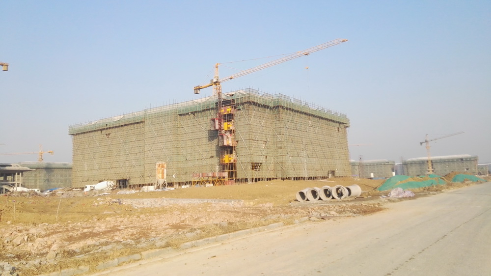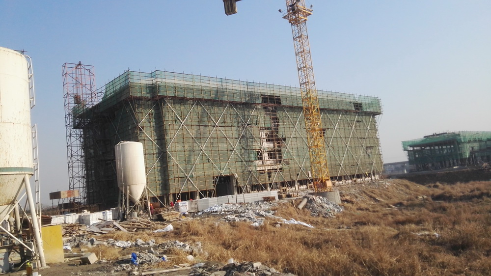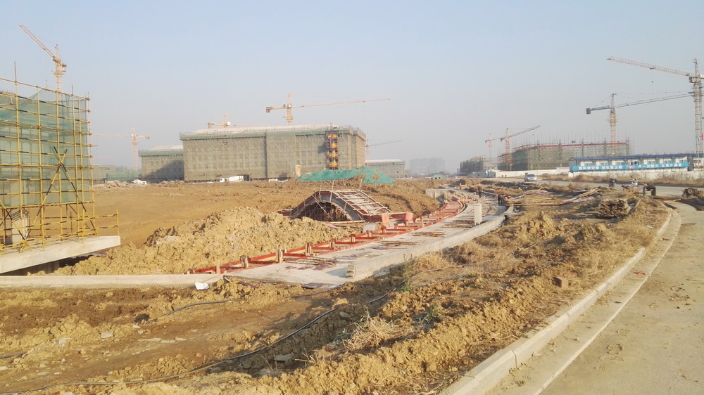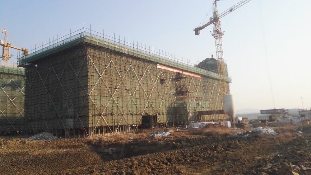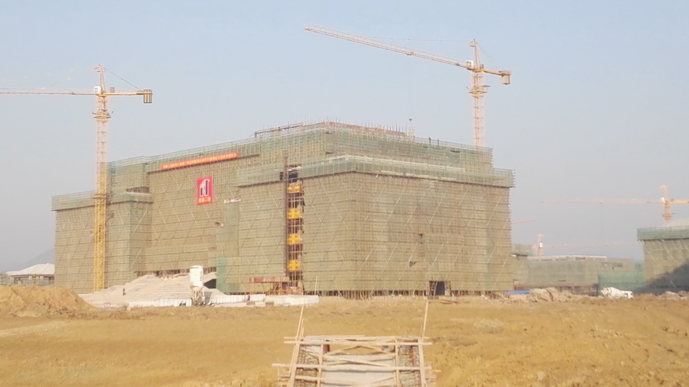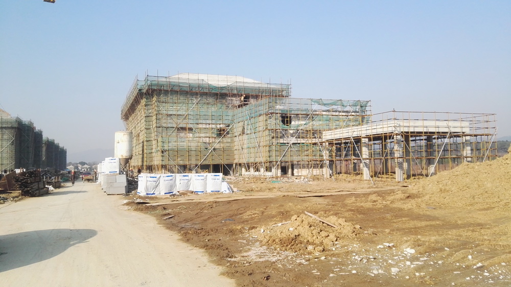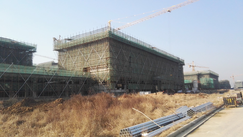 2. 图文信息中心:二、三层墙体砌筑,一层垫层完成50%,屋面构架砼浇筑完成。