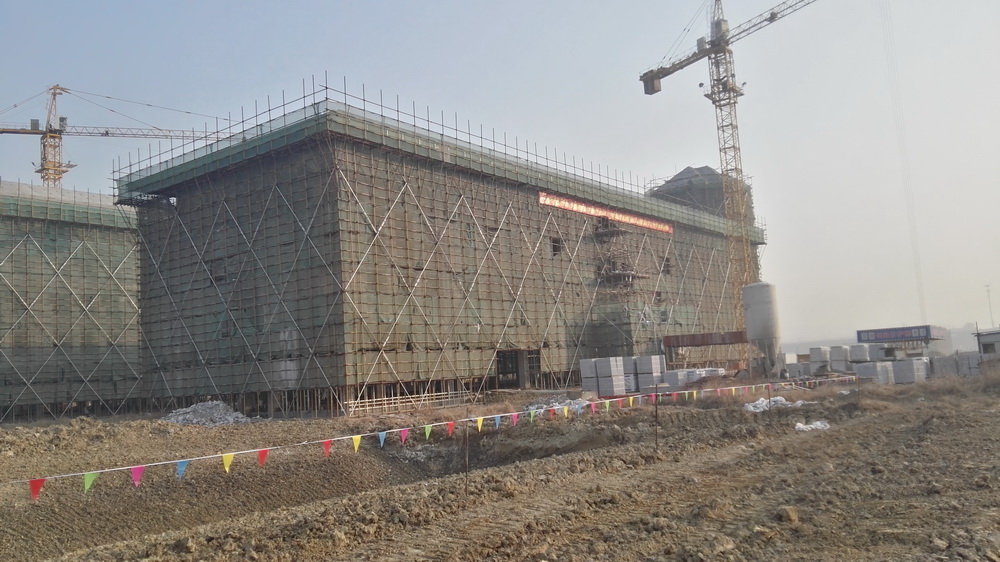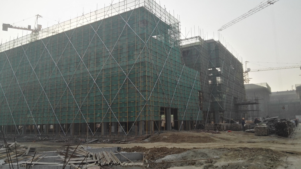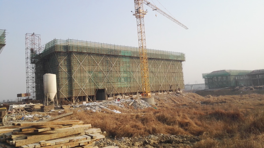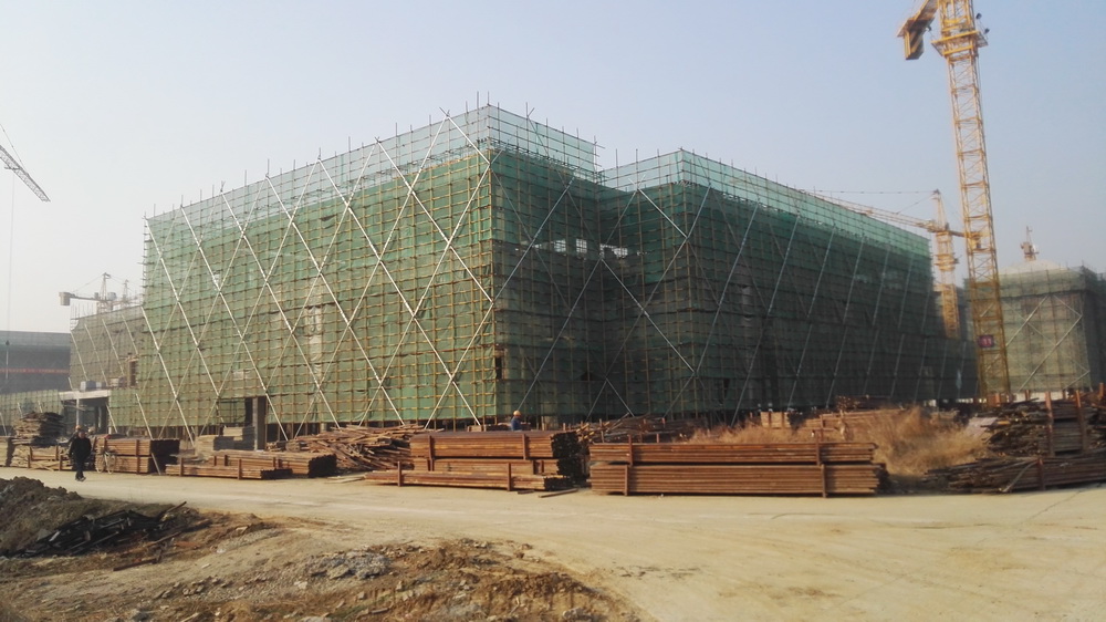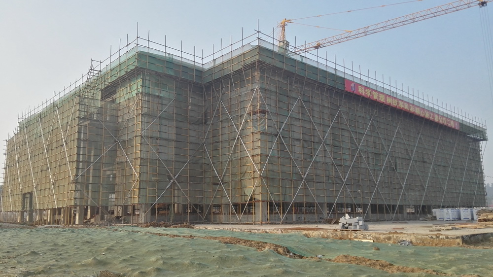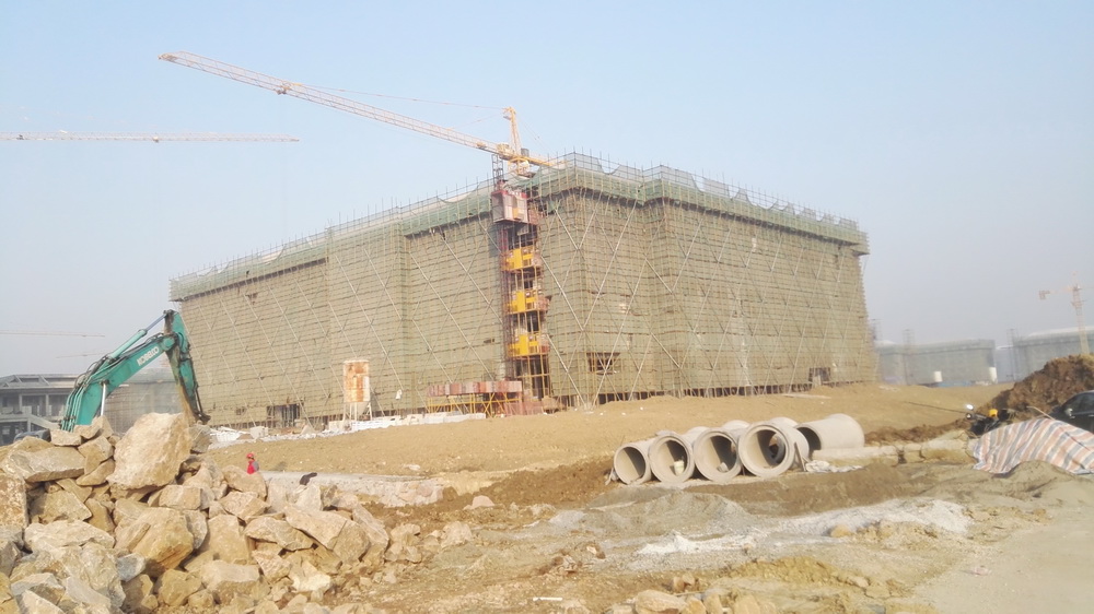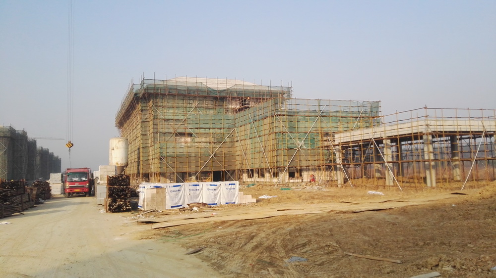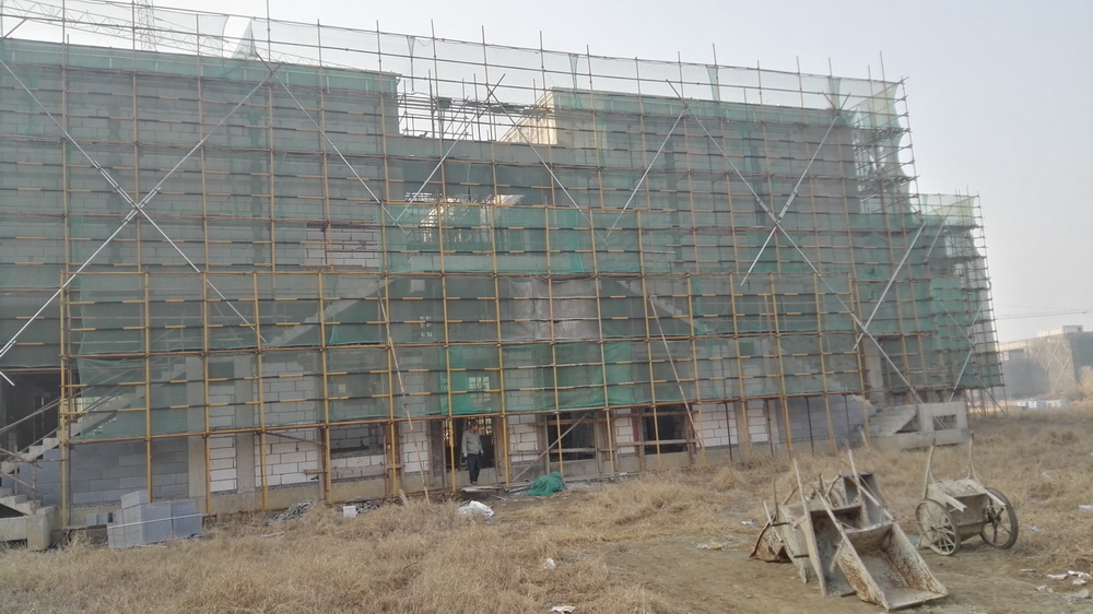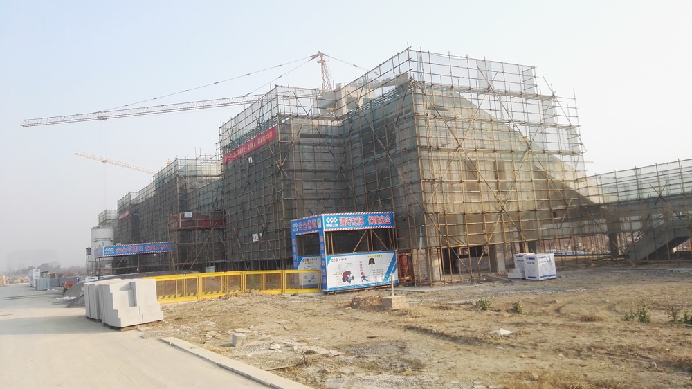 2. 图文信息中心:二、三、四层墙体砌筑完成80%,一层垫层完成50%,屋顶构架浇筑完成。
