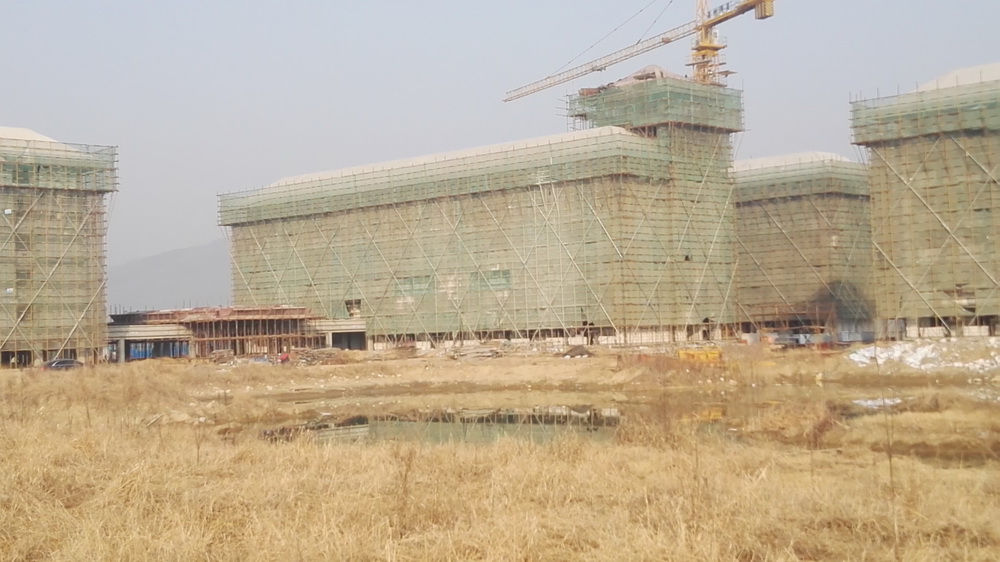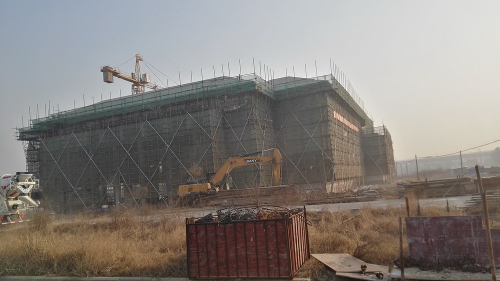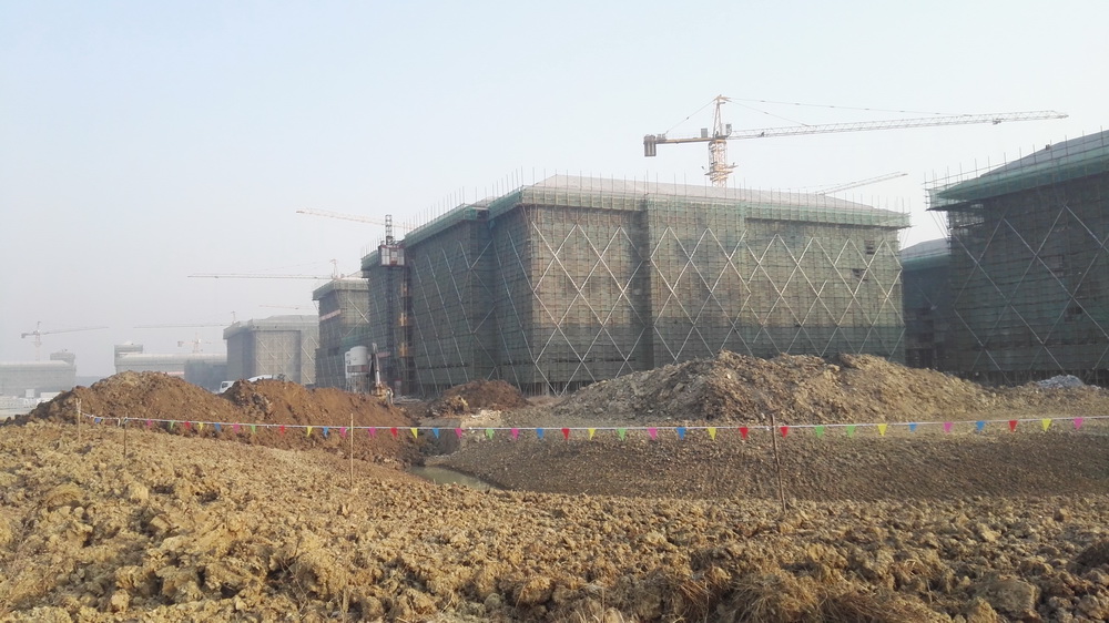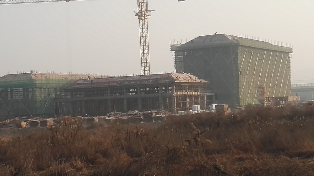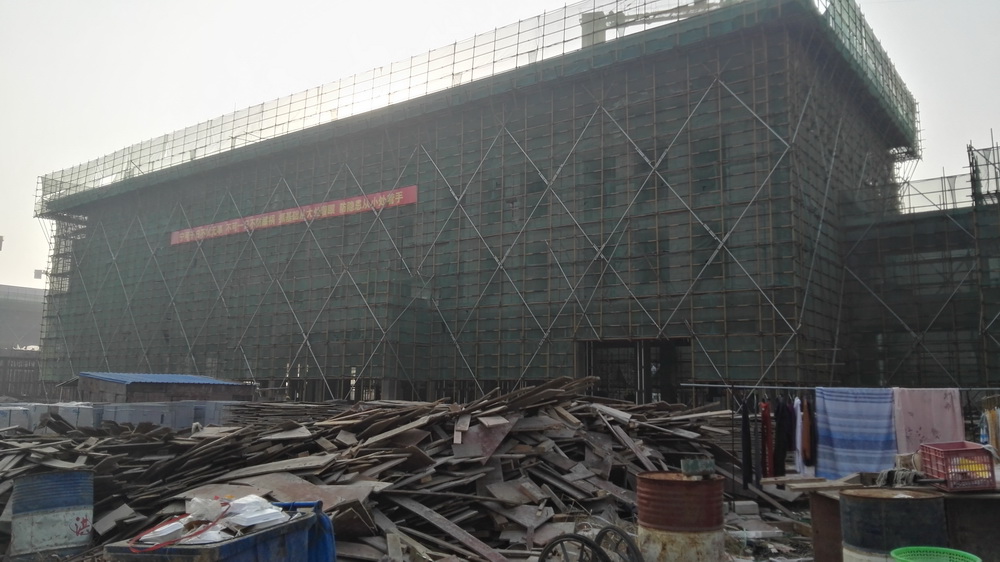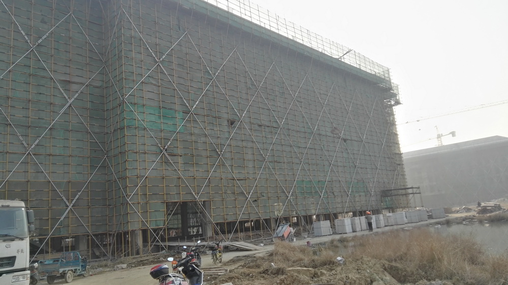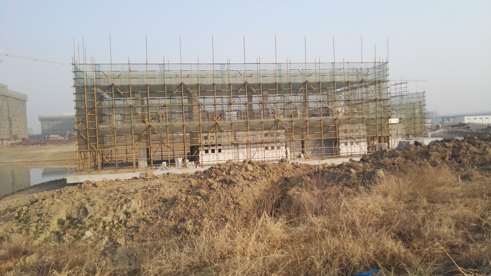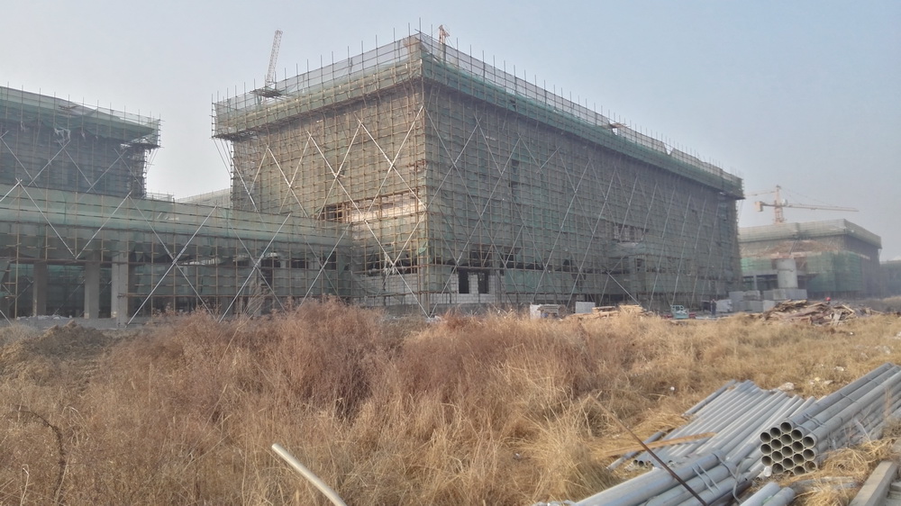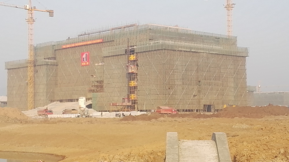 2. 图文信息中心:二、三、四层墙体砌筑完成80%,一层垫层完成50%,屋顶构架浇筑完成。