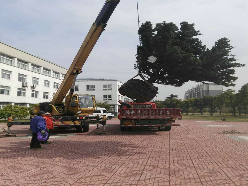 浦口校区教学楼前的五针松,吊装装车,准备运往溧水校区