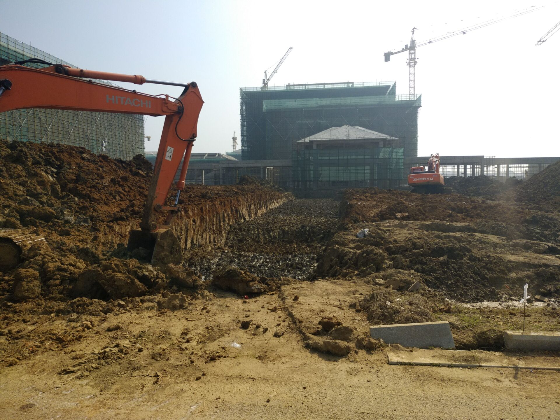 2. 挡土墙挖方及级配碎石换填完成50%;