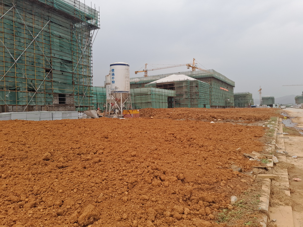 (2)教学组团(理科楼、文科楼、图文信息中心、大学生活动中心、行政楼、公共教学楼、后勤一、二、一食堂、二食堂)内外粉刷完成70%,室内腻子完成30%;